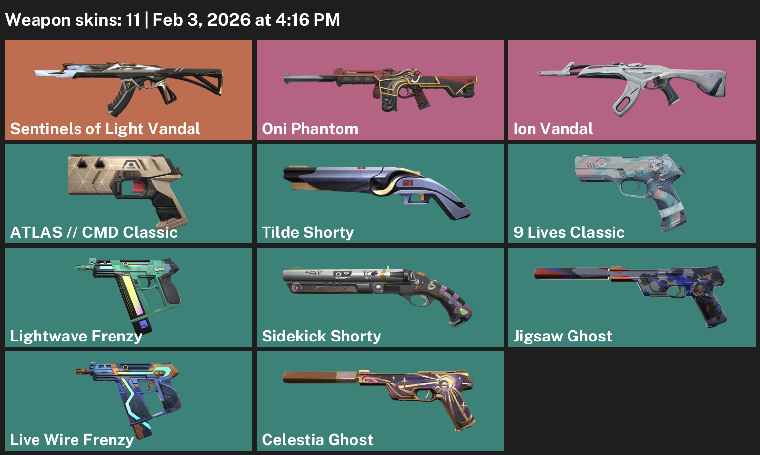Sentinels of Light Vandal, Oni Phantom, ATLAS // CMD Classic, Tilde Shorty, Lightwave Frenzy, Jigsaw Ghost