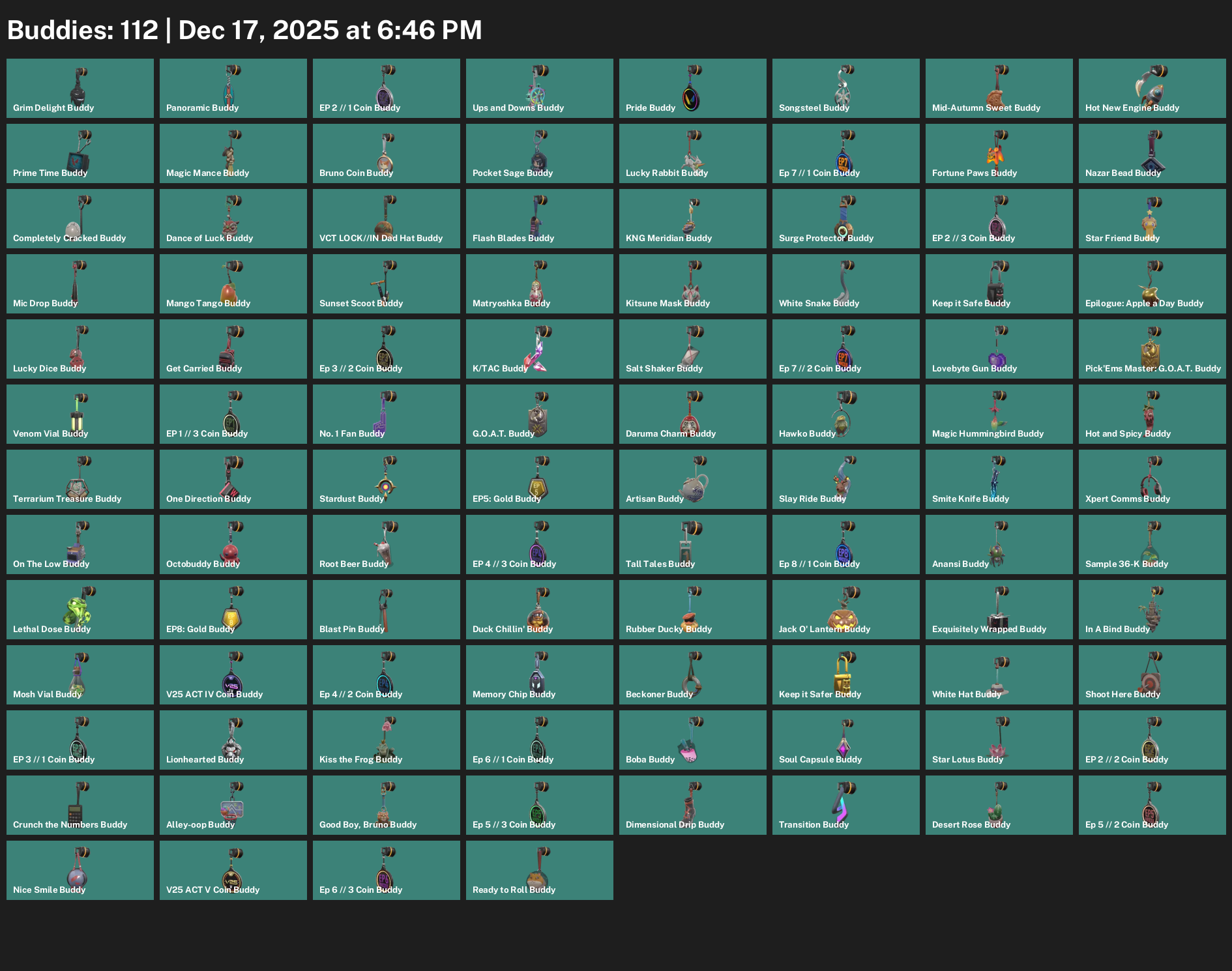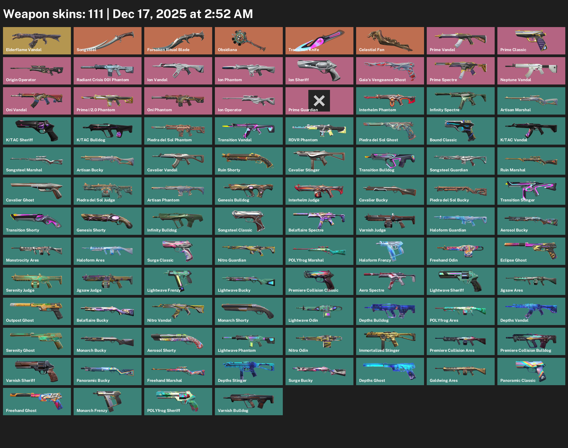 Elderflame Vandal, Songsteel, Forsaken Ritual Blade, Obsidiana, Transition Knife, Celestial Fan, Prime Classic, Origin Operator, Radiant Crisis 001 Phantom, Ion Sheriff, Gaia’s Vengeance Ghost, Infinity Spectre, Artisan Marshal