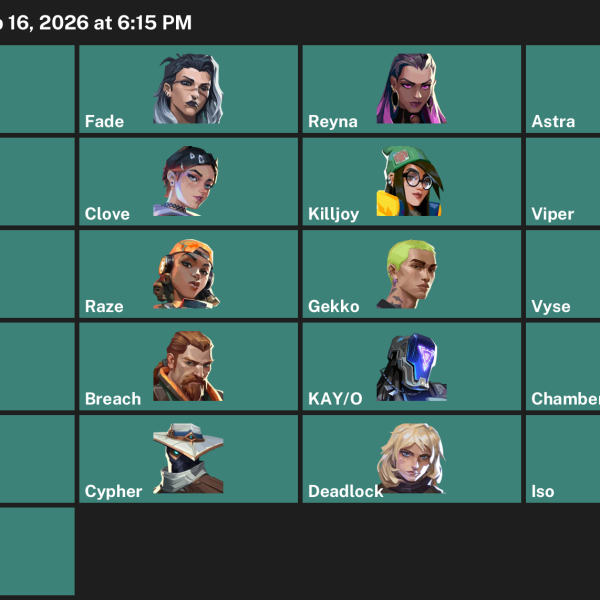 Harbor, Iso, Omen, Reyna, KAY/O, Deadlock, Raze, Neon, Skye, Killjoy, Astra, Yoru, Clove, Vyse, Gekko, Viper, Cypher, Fade, Breach, Chamber