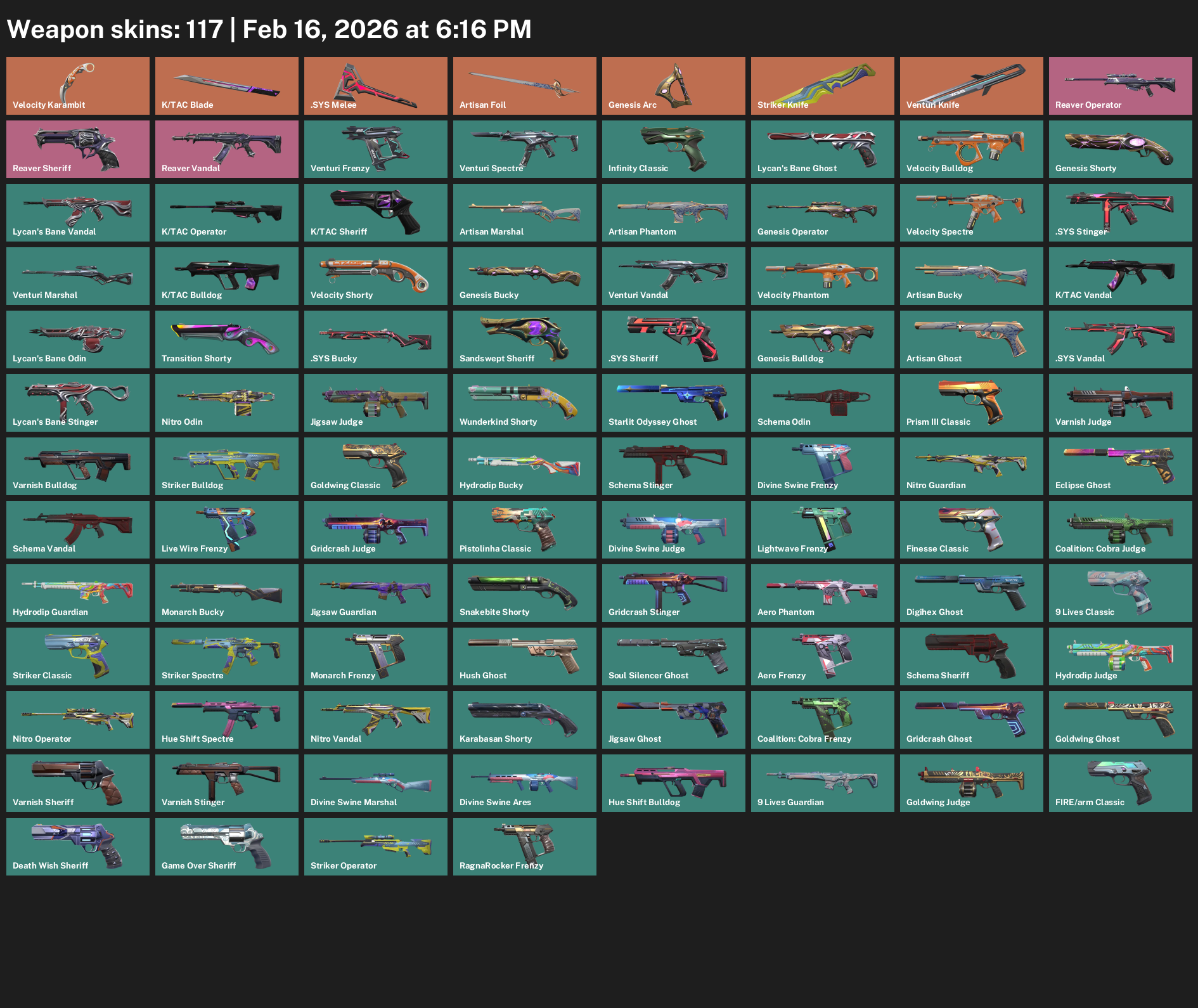 Velocity Karambit, K/TAC Blade, .SYS Melee, Artisan Foil, Genesis Arc, Striker Knife, Reaver Operator, Venturi Frenzy, Infinity Classic, Lycan’s Bane Ghost