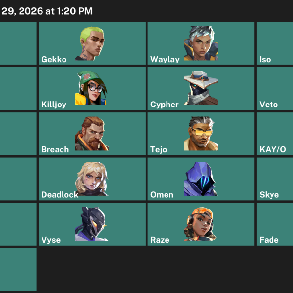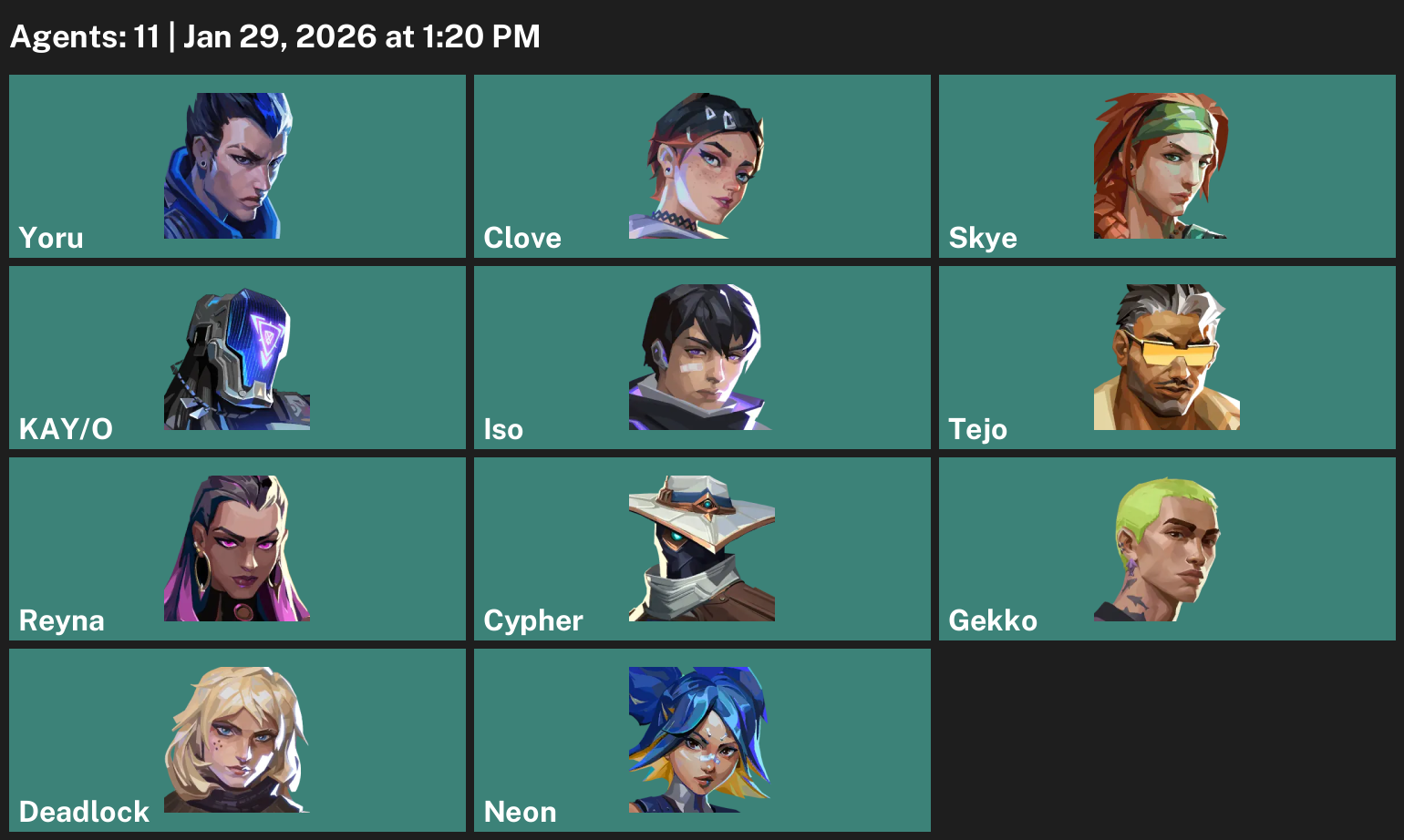 Yoru, Clove, Skye, KAY/O, Iso, Tejo, Reyna, Cypher, Gekko, Deadlock, Neon