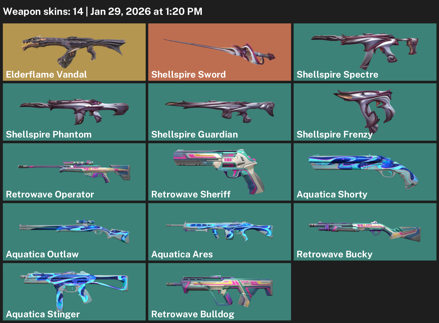 Elderflame Vandal, Shellspire Sword, Retrowave Operator, Aquatica Shorty