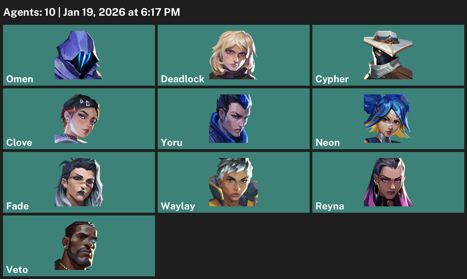 Omen, Deadlock, Cypher, Clove, Yoru, Neon, Fade, Waylay, Reyna
