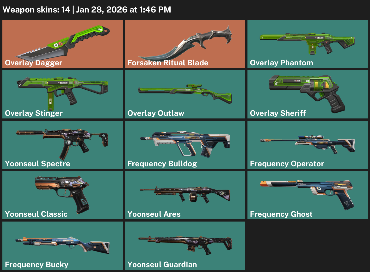Overlay Dagger, Forsaken Ritual Blade, Yoonseul Spectre, Frequency Bulldog