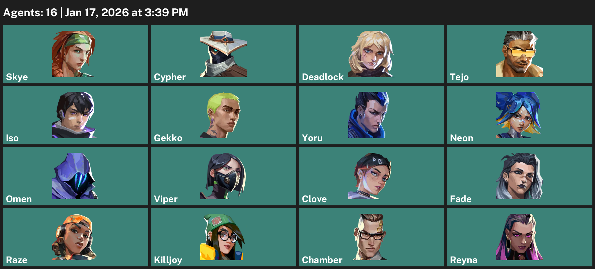 Skye, Cypher, Deadlock, Tejo, Iso, Gekko, Yoru, Neon, Omen, Viper, Clove, Fade, Raze, Killjoy, Chamber, Reyna