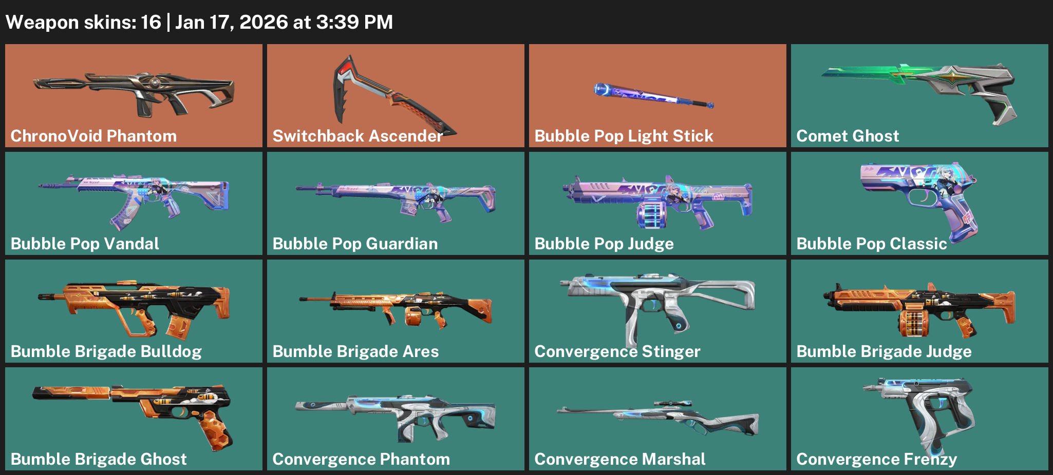 ChronoVoid Phantom, Switchback Ascender, Bubble Pop Light Stick, Comet Ghost, Bumble Brigade Bulldog, Convergence Stinger