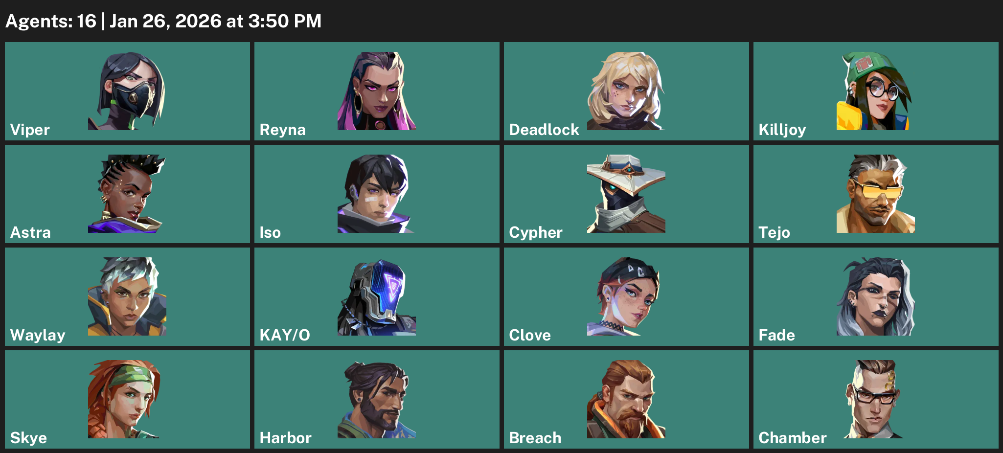 Viper, Reyna, Deadlock, Killjoy, Astra, Iso, Cypher, Tejo, Waylay, KAY/O, Clove, Fade, Skye, Harbor, Breach, Chamber