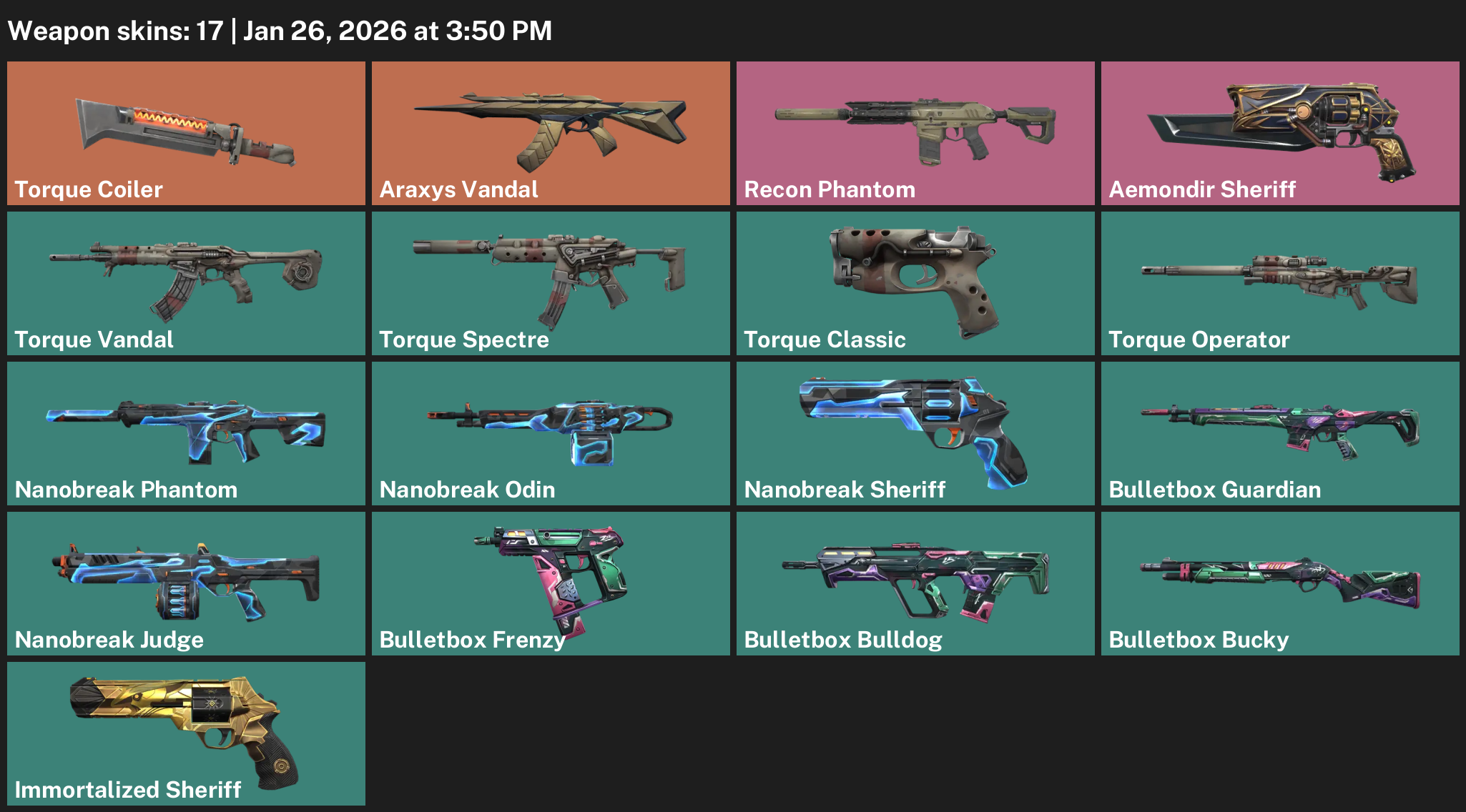 Torque Coiler, Araxys Vandal, Recon Phantom, Aemondir Sheriff, Nanobreak Odin, Bulletbox Guardian