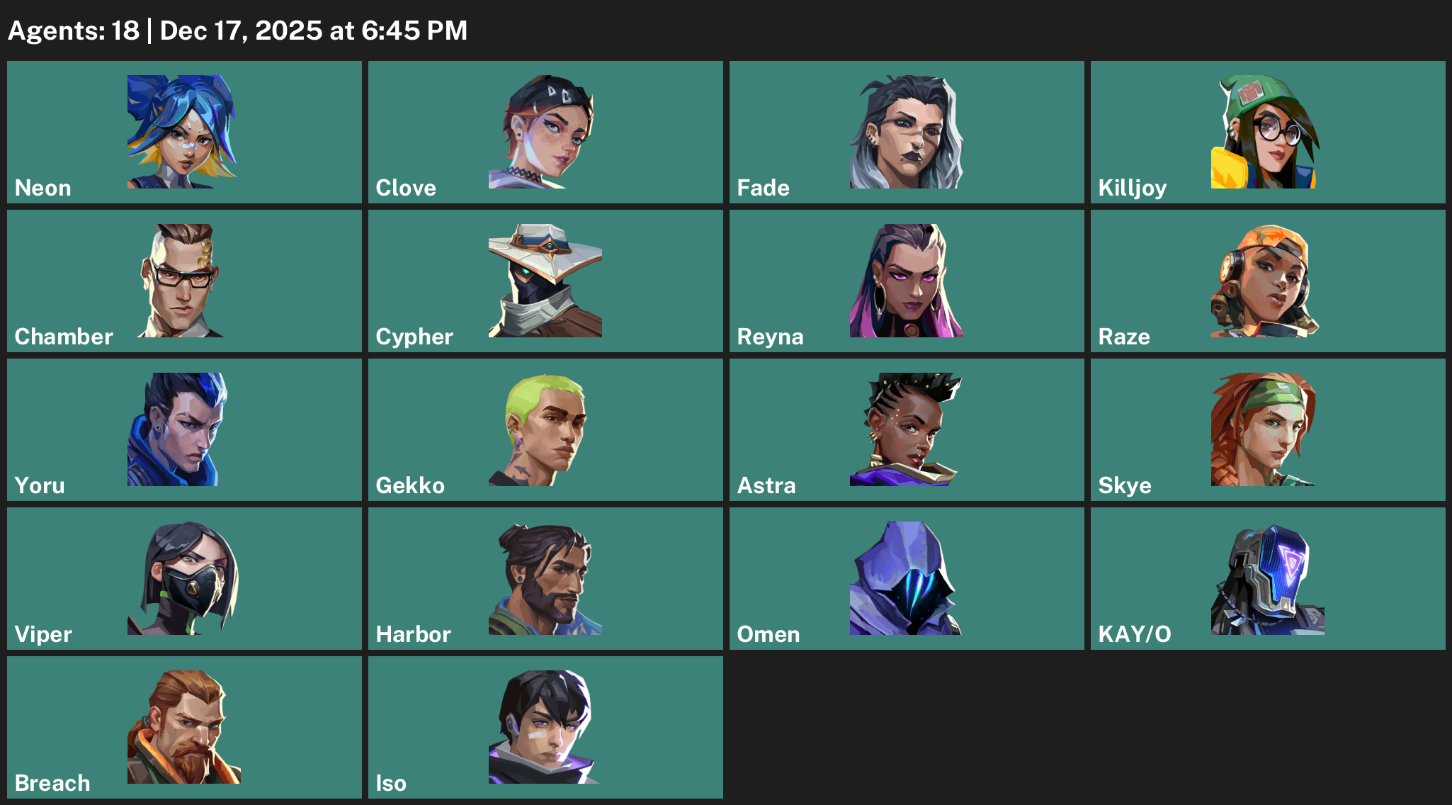 Neon, Clove, Fade, Killjoy, Chamber, Cypher, Reyna, Raze, Yoru, Gekko, Astra, Skye, Viper, Harbor, Omen, KAY/O, Breach, Iso