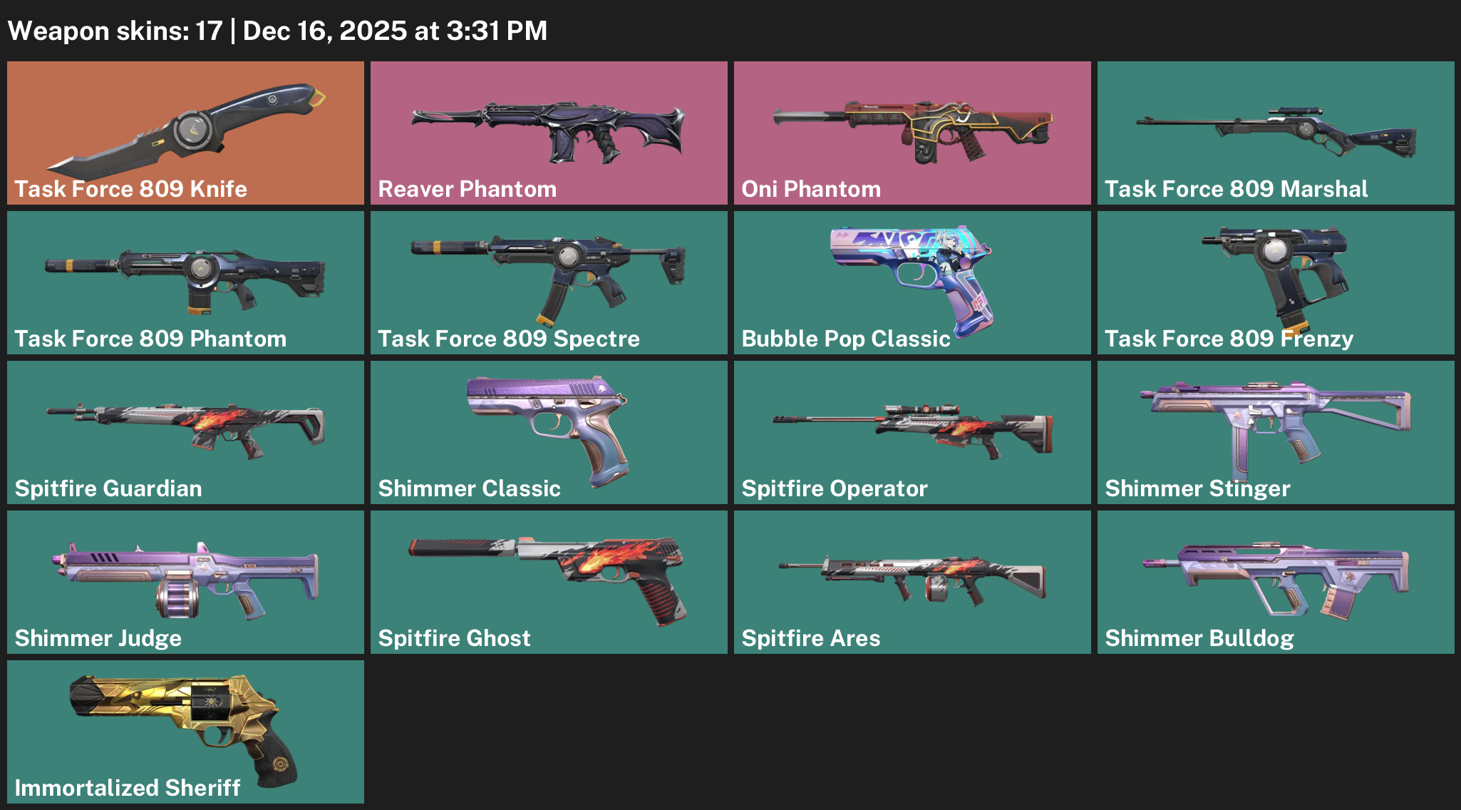 Task Force 809 Knife, Reaver Phantom, Bubble Pop Classic, Spitfire Guardian, Shimmer Stinger, Immortalized Sheriff