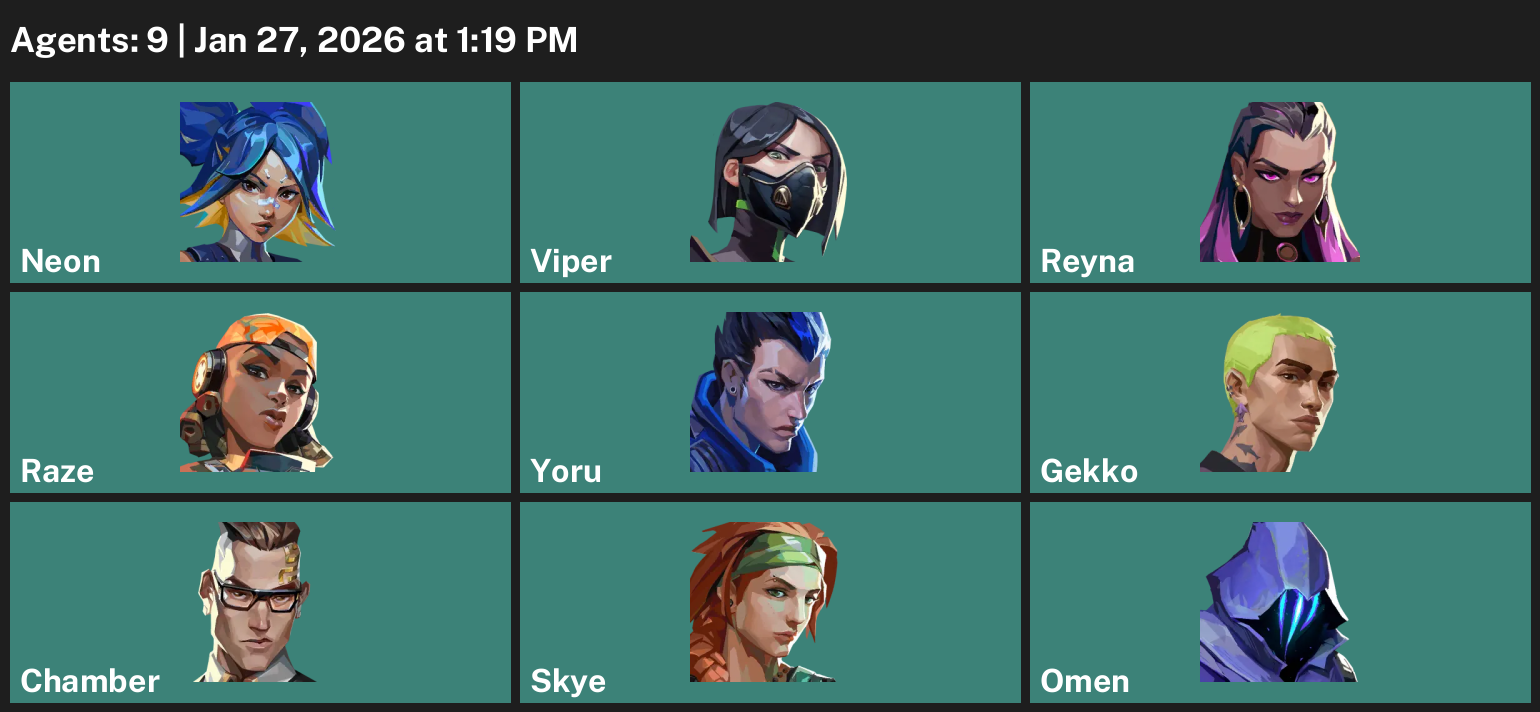 Neon, Viper, Reyna, Raze, Yoru, Gekko, Chamber, Skye, Omen