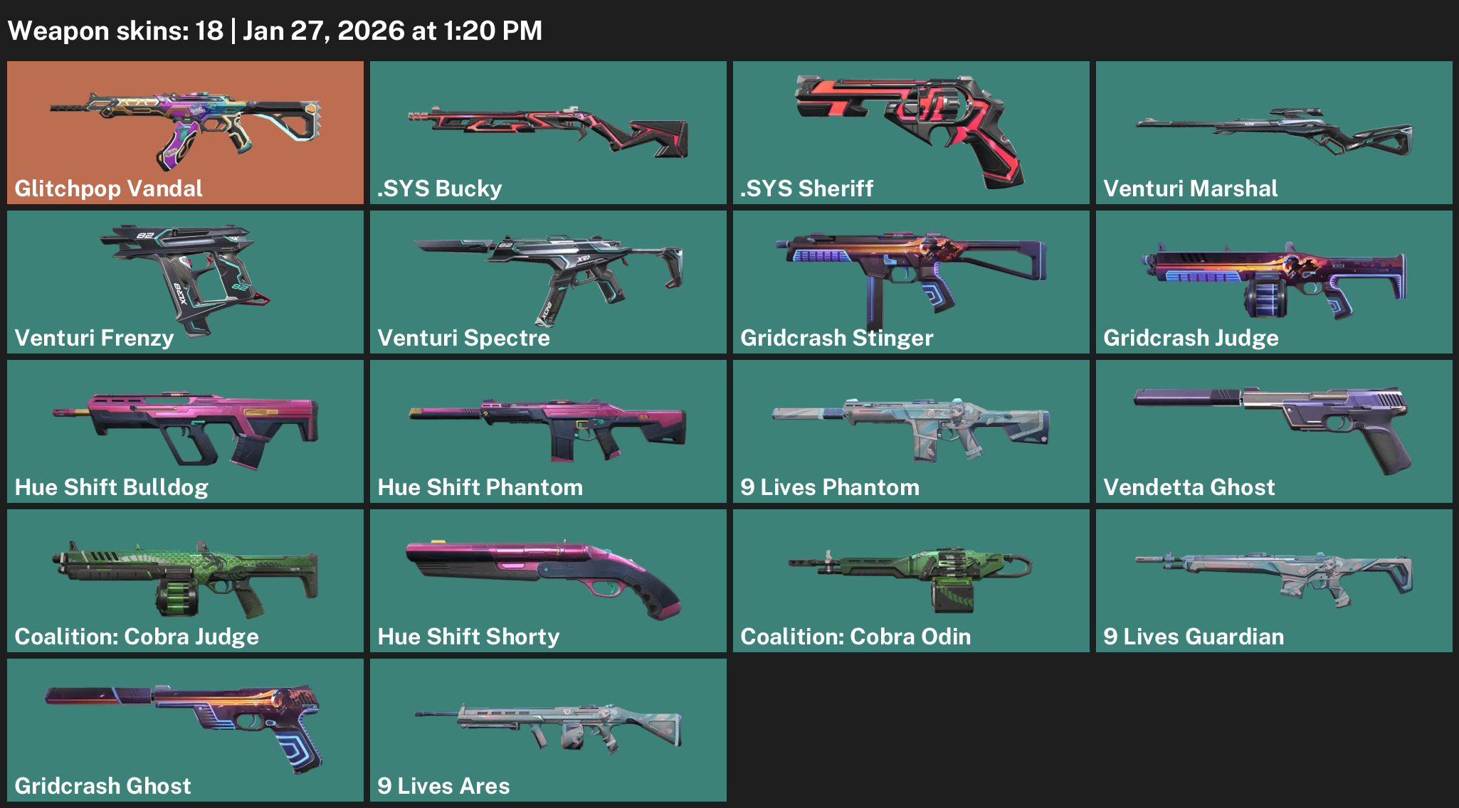 Glitchpop Vandal, .SYS Bucky, Venturi Marshal, Gridcrash Stinger, Hue Shift Bulldog, 9 Lives Phantom, Vendetta Ghost, Coalition: Cobra Judge
