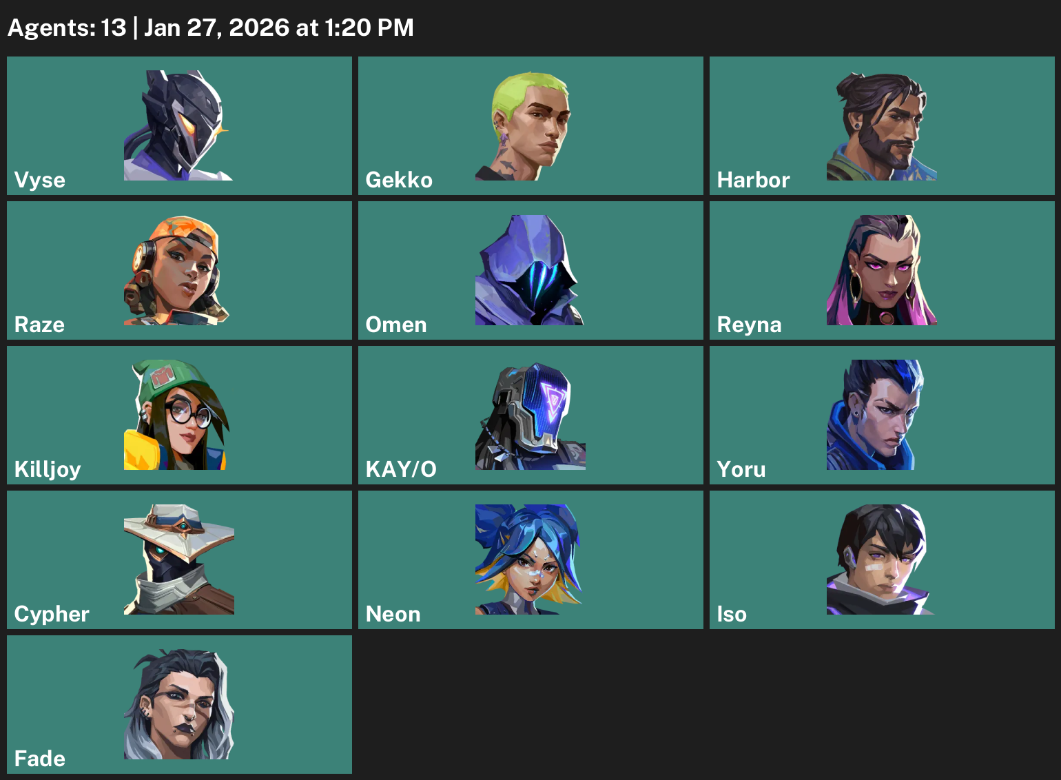 Vyse, Gekko, Harbor, Raze, Omen, Reyna, Killjoy, KAY/O, Yoru, Cypher, Neon, Iso, Fade