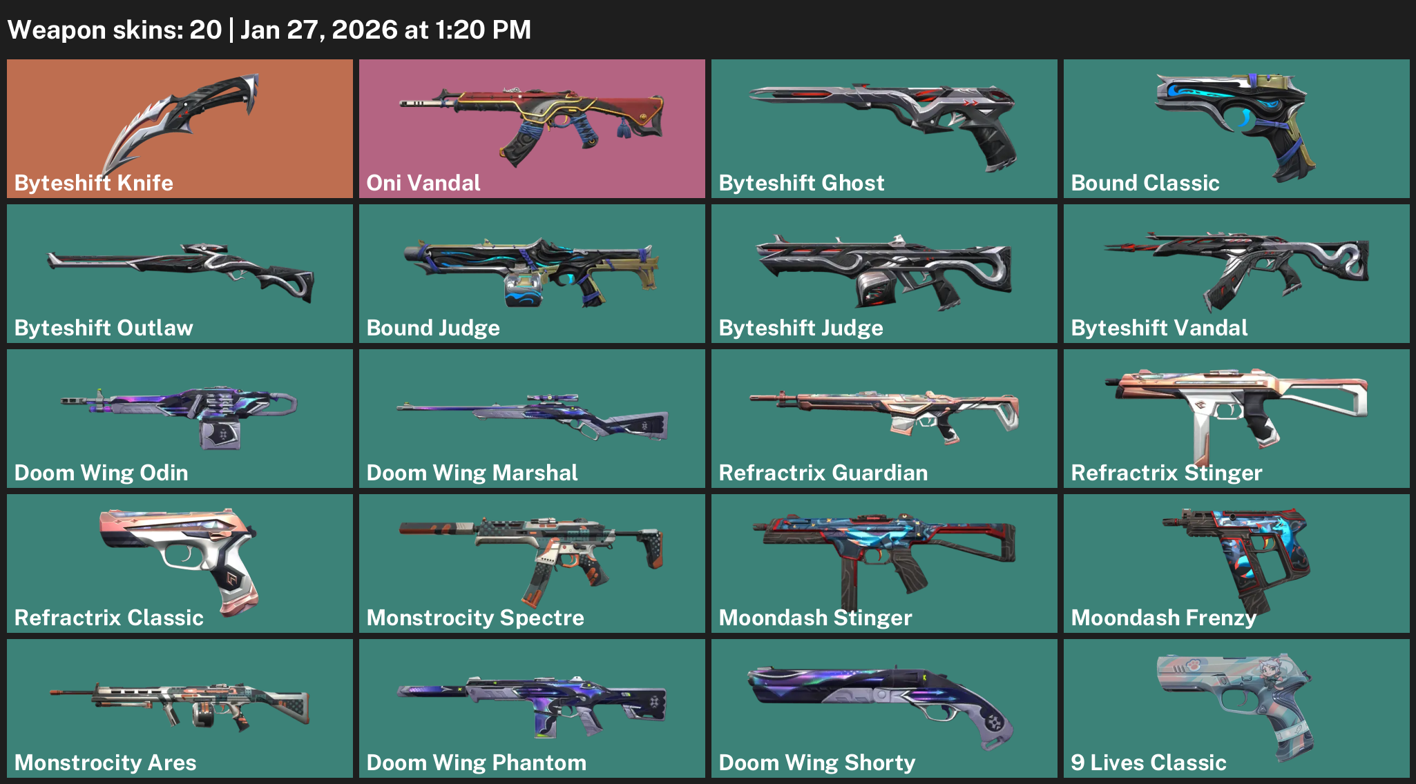 Byteshift Knife, Oni Vandal, Bound Classic, Doom Wing Odin, Refractrix Guardian, Monstrocity Spectre, Moondash Stinger