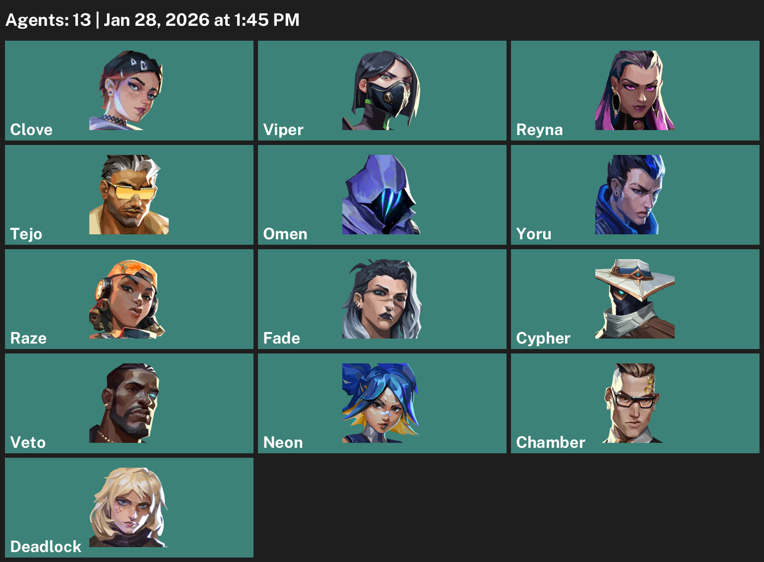 Clove, Viper, Reyna, Tejo, Omen, Yoru, Raze, Fade, Cypher, Neon, Chamber, Deadlock