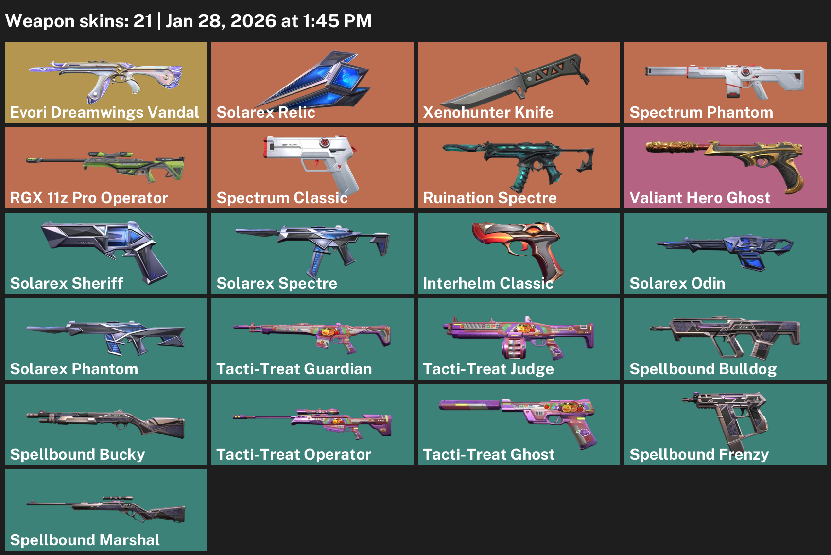 Evori Dreamwings Vandal, Solarex Relic, Xenohunter Knife, Spectrum Phantom, RGX 11z Pro Operator, Ruination Spectre, Valiant Hero Ghost, Interhelm Classic, Tacti-Treat Guardian, Spellbound Bulldog