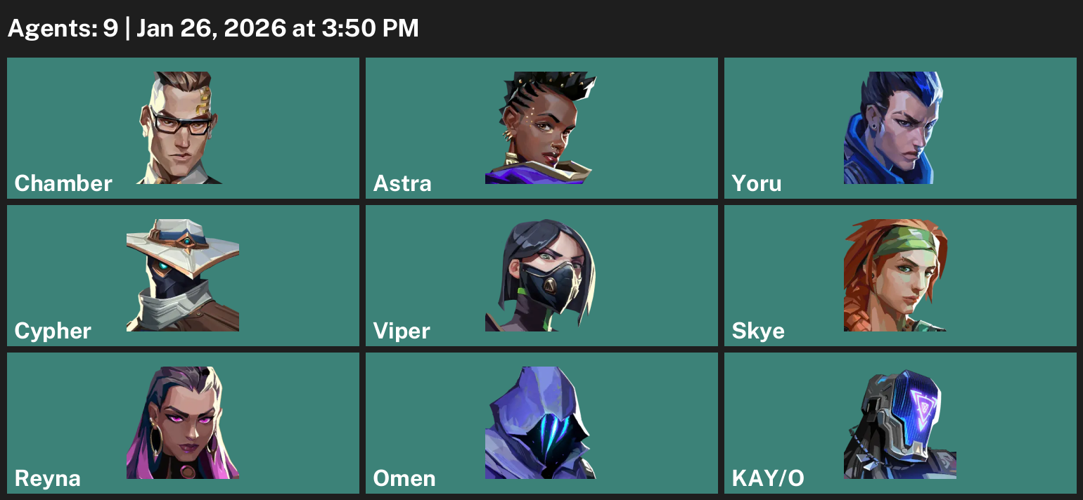 Chamber, Astra, Yoru, Cypher, Viper, Skye, Reyna, Omen, KAY/O