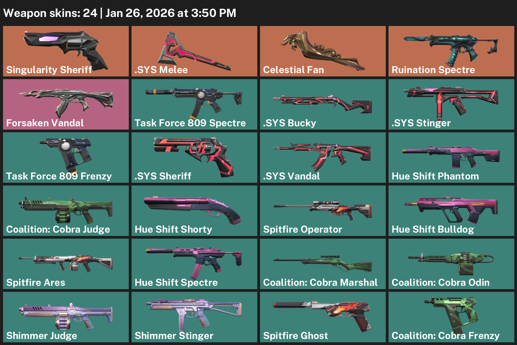 Singularity Sheriff, .SYS Melee, Celestial Fan, Ruination Spectre, Forsaken Vandal, Task Force 809 Frenzy, Hue Shift Phantom, Coalition: Cobra Judge, Spitfire Operator, Shimmer Stinger