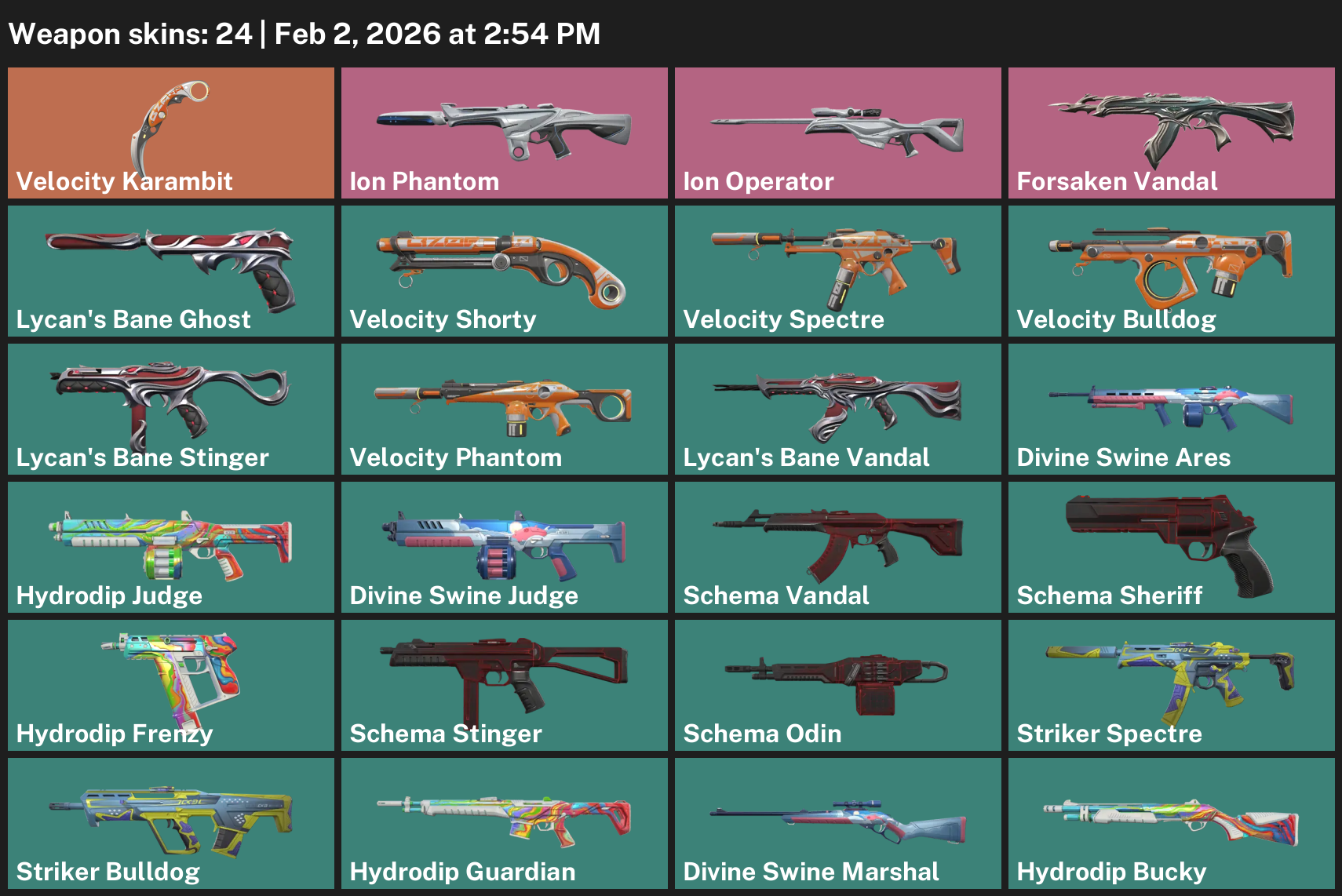 Velocity Karambit, Ion Phantom, Forsaken Vandal, Lycan’s Bane Ghost, Divine Swine Ares, Hydrodip Judge, Schema Sheriff, Striker Spectre