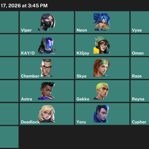 Reyna, Chamber, Omen, Cypher, Skye, Raze, Yoru, Iso, Fade, Viper