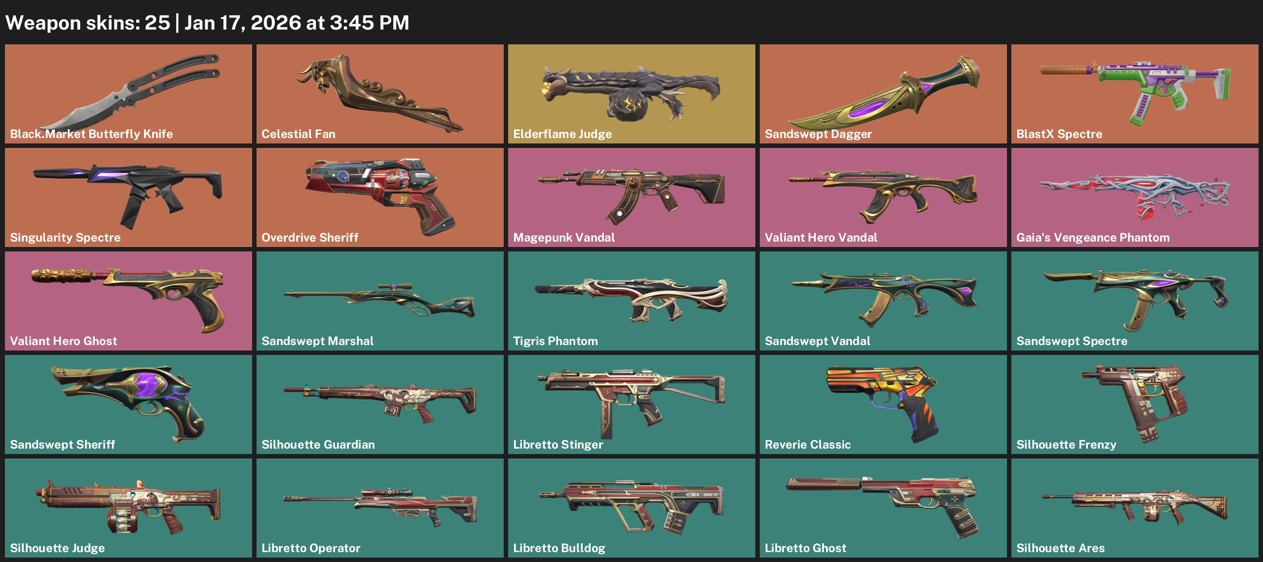 Black.Market Butterfly Knife, Celestial Fan, Elderflame Judge, Sandswept Dagger, BlastX Spectre, Overdrive Sheriff, Magepunk Vandal, Gaia’s Vengeance Phantom, Valiant Hero Ghost, Silhouette Guardian, Libretto Stinger, Reverie Classic