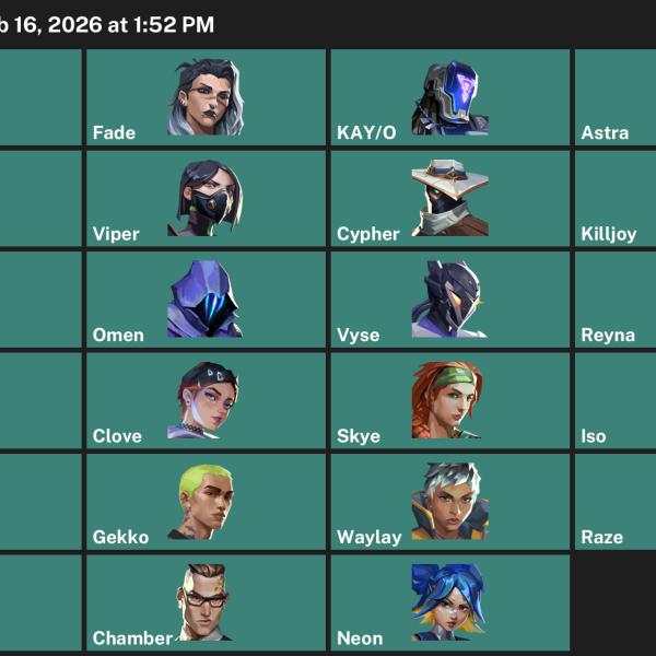 Fade, Cypher, Killjoy, Viper, Astra, Skye, Chamber, KAY/O, Harbor, Reyna, Raze, Neon, Yoru, Omen