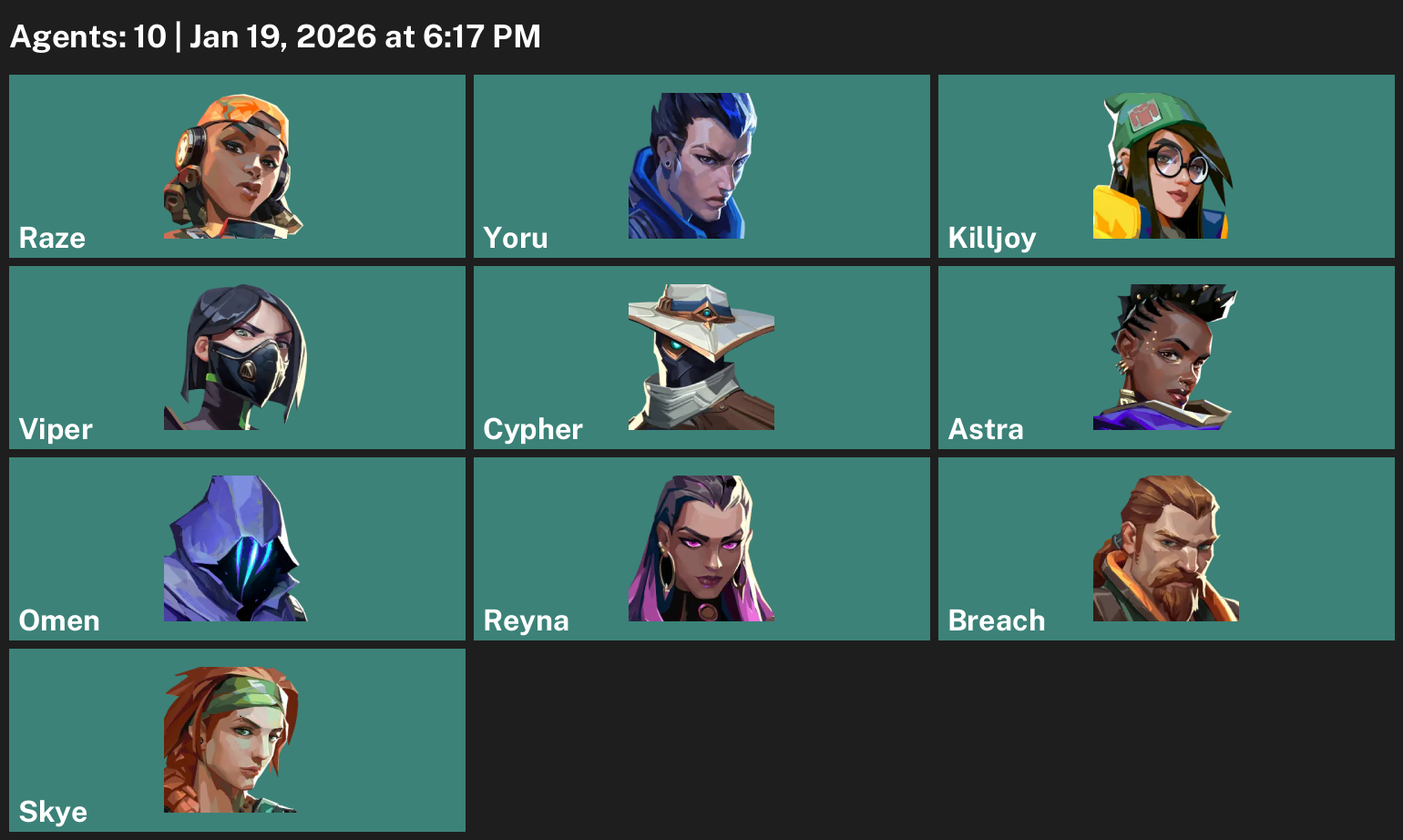 Raze, Yoru, Killjoy, Viper, Cypher, Astra, Omen, Reyna, Breach, Skye