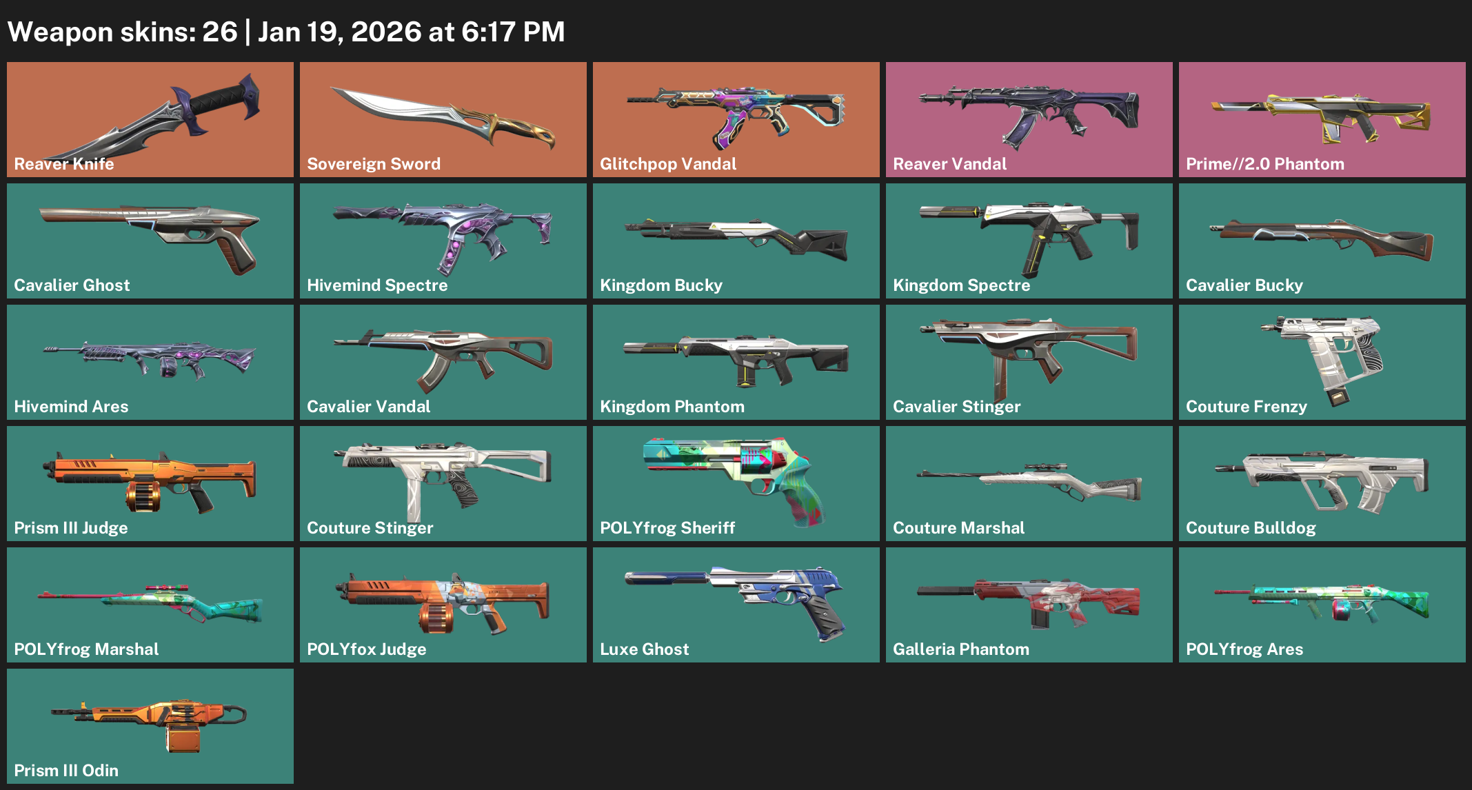 Reaver Knife, Sovereign Sword, Glitchpop Vandal, Prime//2.0 Phantom, Cavalier Ghost, Hivemind Spectre, Kingdom Bucky, Couture Frenzy, Prism III Judge, POLYfrog Sheriff