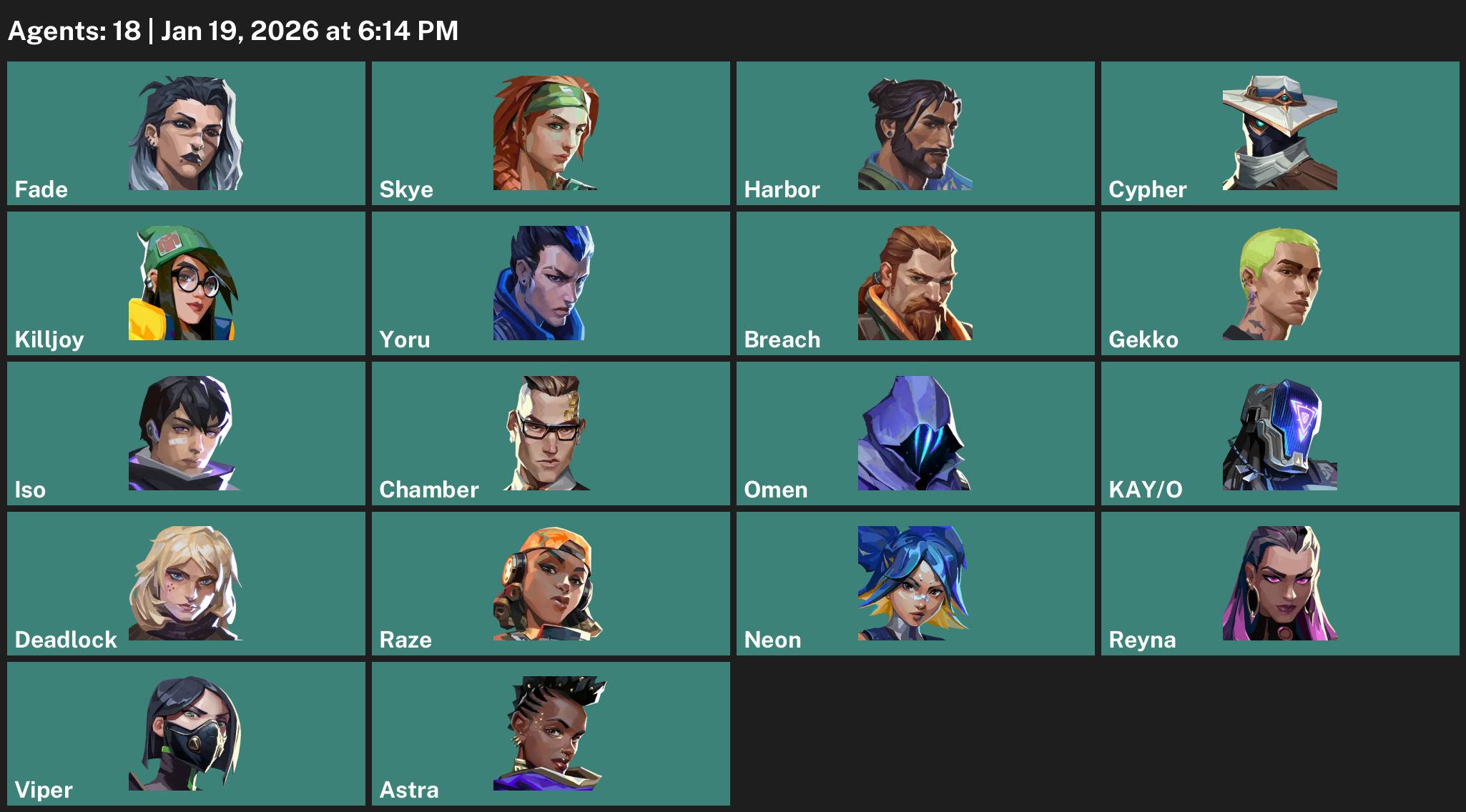 Fade, Skye, Harbor, Cypher, Killjoy, Yoru, Breach, Gekko, Iso, Chamber, Omen, KAY/O, Deadlock, Raze, Neon, Reyna, Viper, Astra