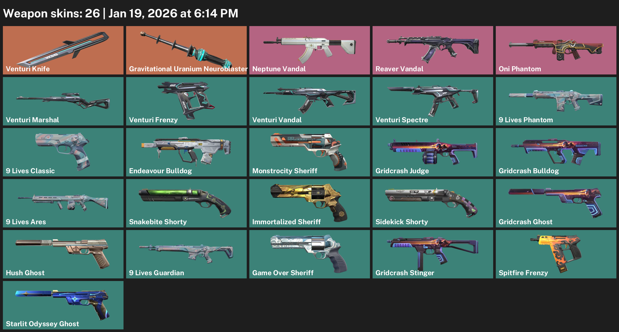 Venturi Knife, Gravitational Uranium Neuroblaster Baton, Neptune Vandal, Oni Phantom, 9 Lives Classic, Endeavour Bulldog, Monstrocity Sheriff, Gridcrash Judge, Snakebite Shorty, Hush Ghost, Spitfire Frenzy