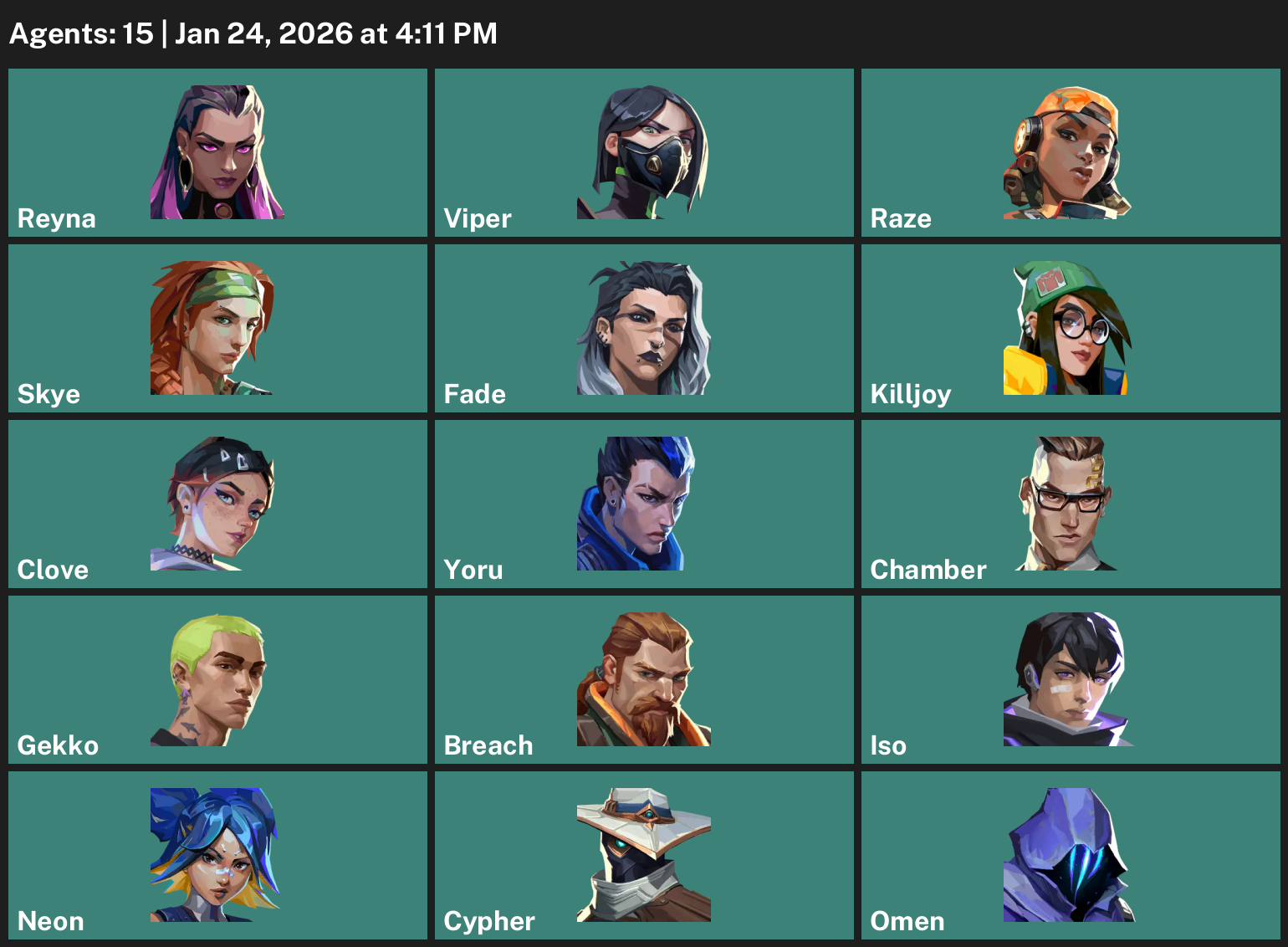 Reyna, Viper, Raze, Skye, Fade, Killjoy, Clove, Yoru, Chamber, Gekko, Breach, Iso, Neon, Cypher, Omen