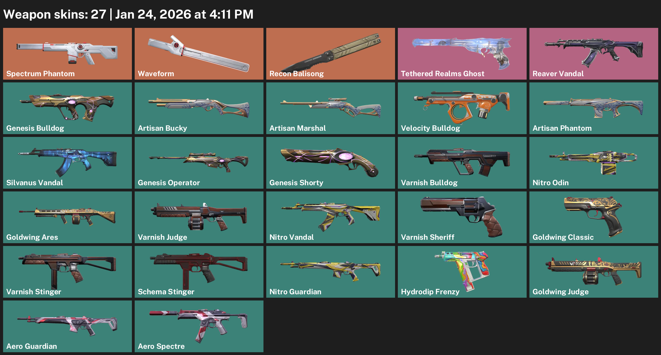 Spectrum Phantom, Waveform, Recon Balisong, Tethered Realms Ghost, Reaver Vandal, Genesis Bulldog, Artisan Bucky, Nitro Odin, Goldwing Ares, Varnish Judge, Schema Stinger, Hydrodip Frenzy