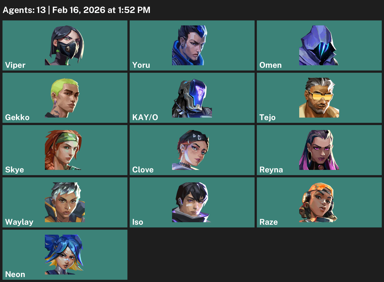 Viper, Yoru, Omen, Gekko, KAY/O, Tejo, Skye, Clove, Reyna, Waylay, Iso, Raze, Neon