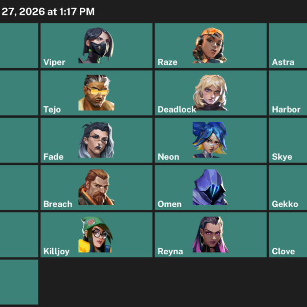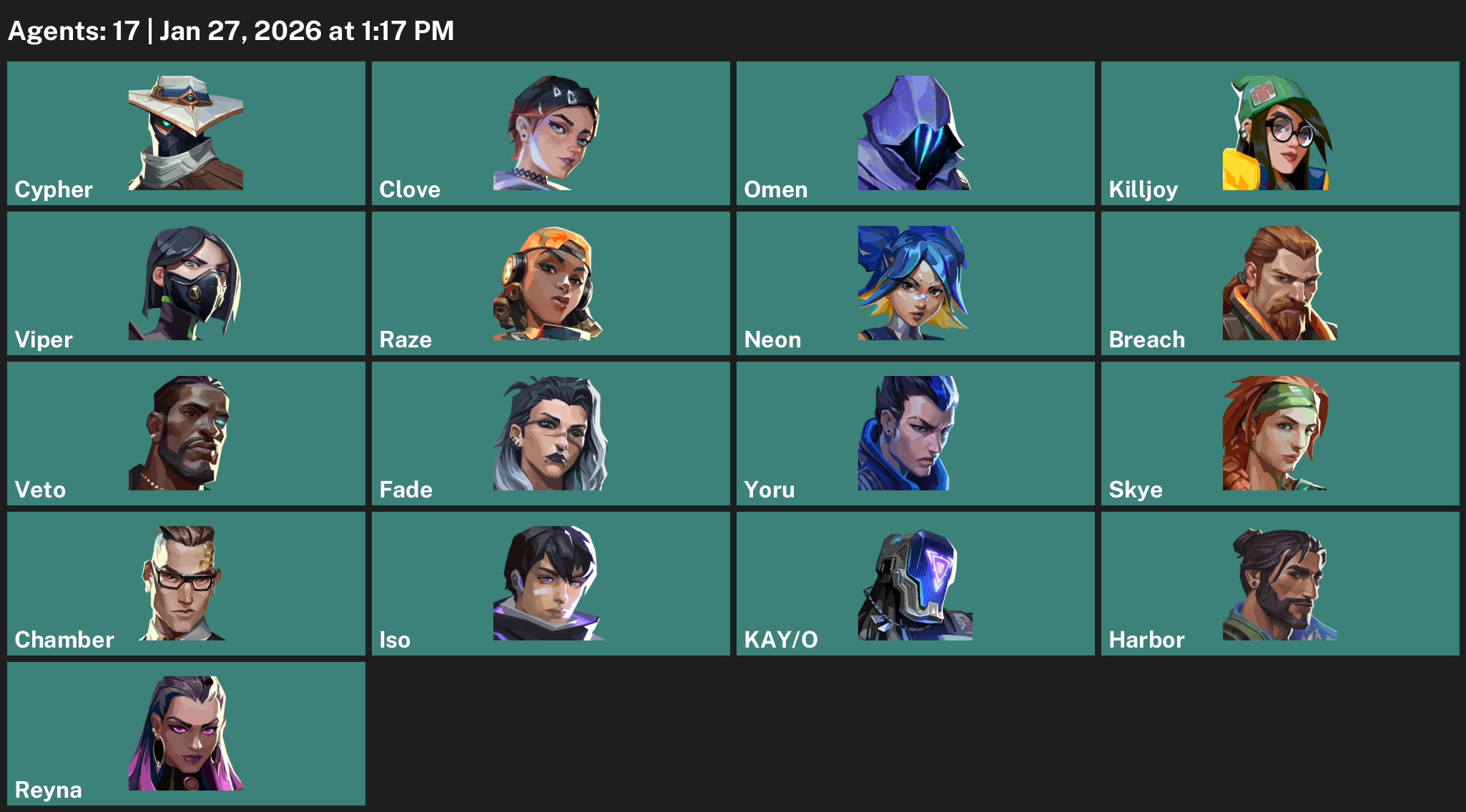 Cypher, Clove, Omen, Killjoy, Viper, Raze, Neon, Breach, Fade, Yoru, Skye, Chamber, Iso, KAY/O, Harbor, Reyna