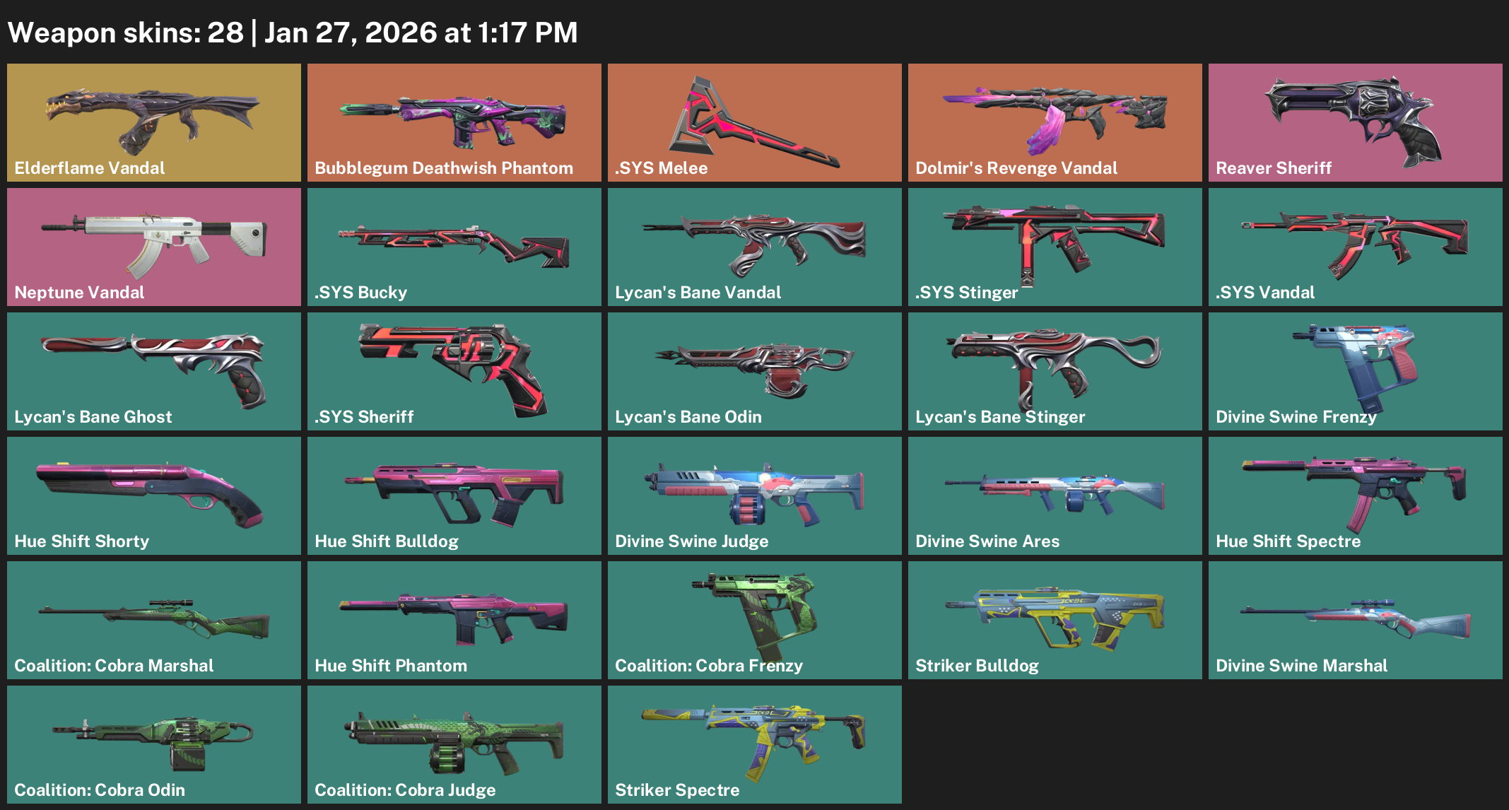 Elderflame Vandal, Bubblegum Deathwish Phantom, .SYS Melee, Reaver Sheriff, Lycan’s Bane Ghost, Divine Swine Frenzy, Hue Shift Shorty, Coalition: Cobra Marshal, Striker Bulldog