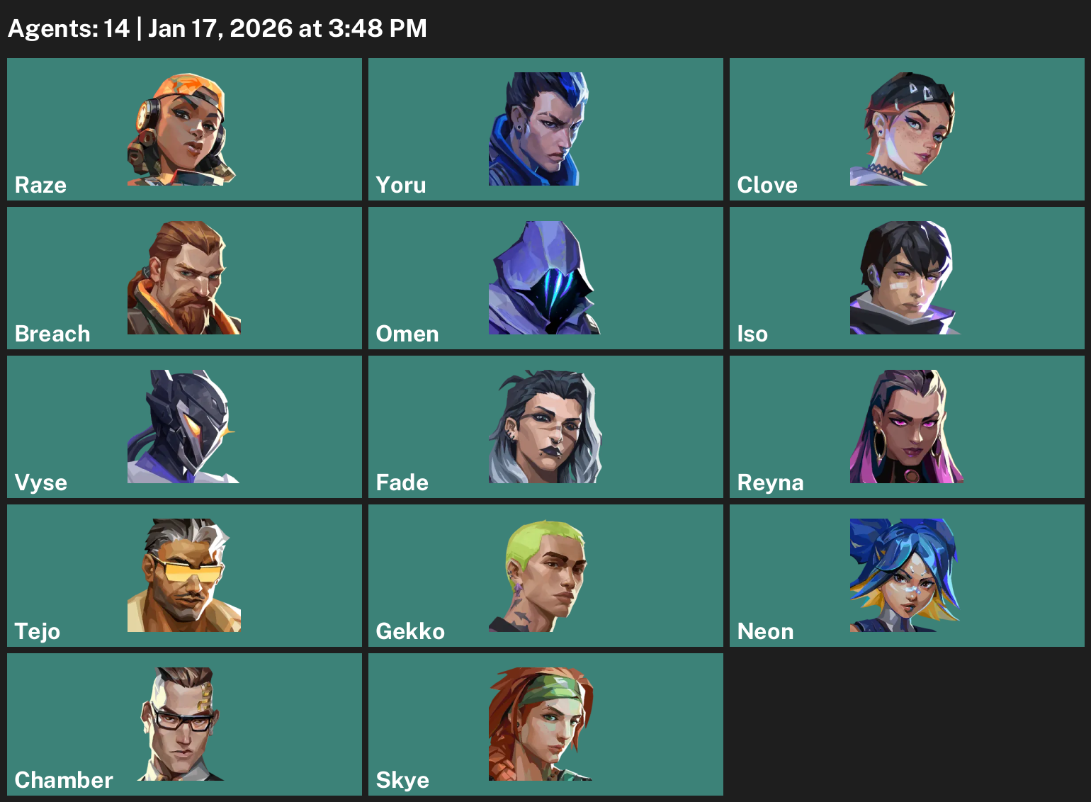 Raze, Yoru, Clove, Breach, Omen, Iso, Vyse, Fade, Reyna, Tejo, Gekko, Neon, Chamber, Skye