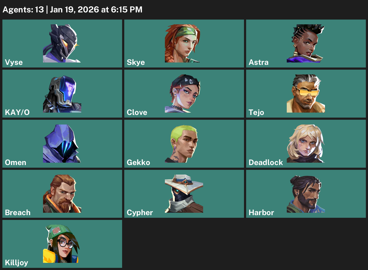 Vyse, Skye, Astra, KAY/O, Clove, Tejo, Omen, Gekko, Deadlock, Breach, Cypher, Harbor, Killjoy