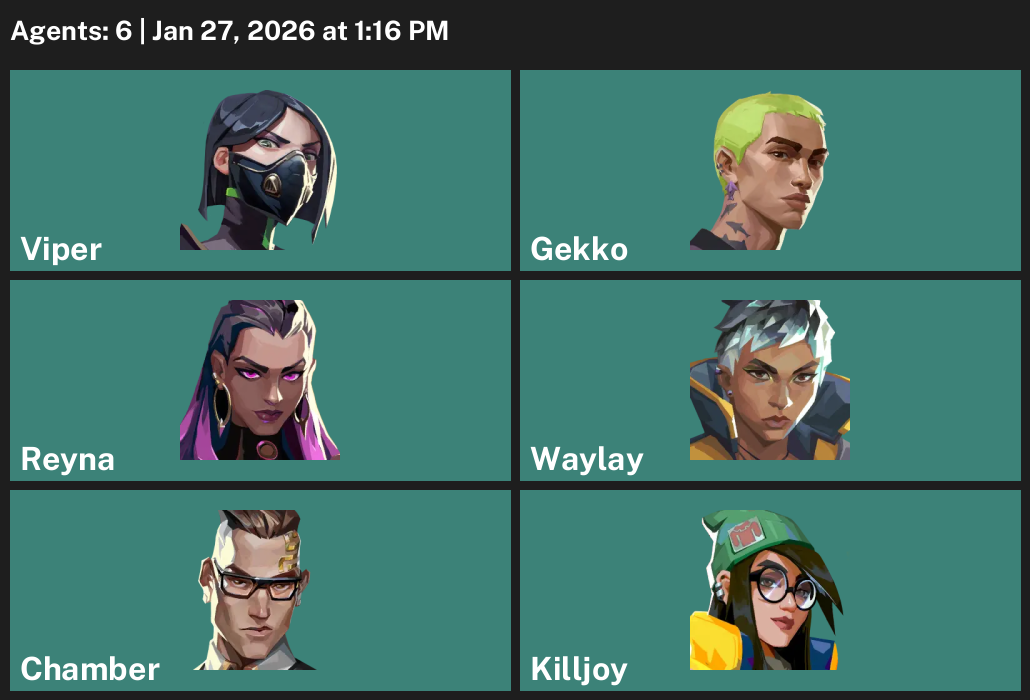 Viper, Gekko, Reyna, Waylay, Chamber, Killjoy