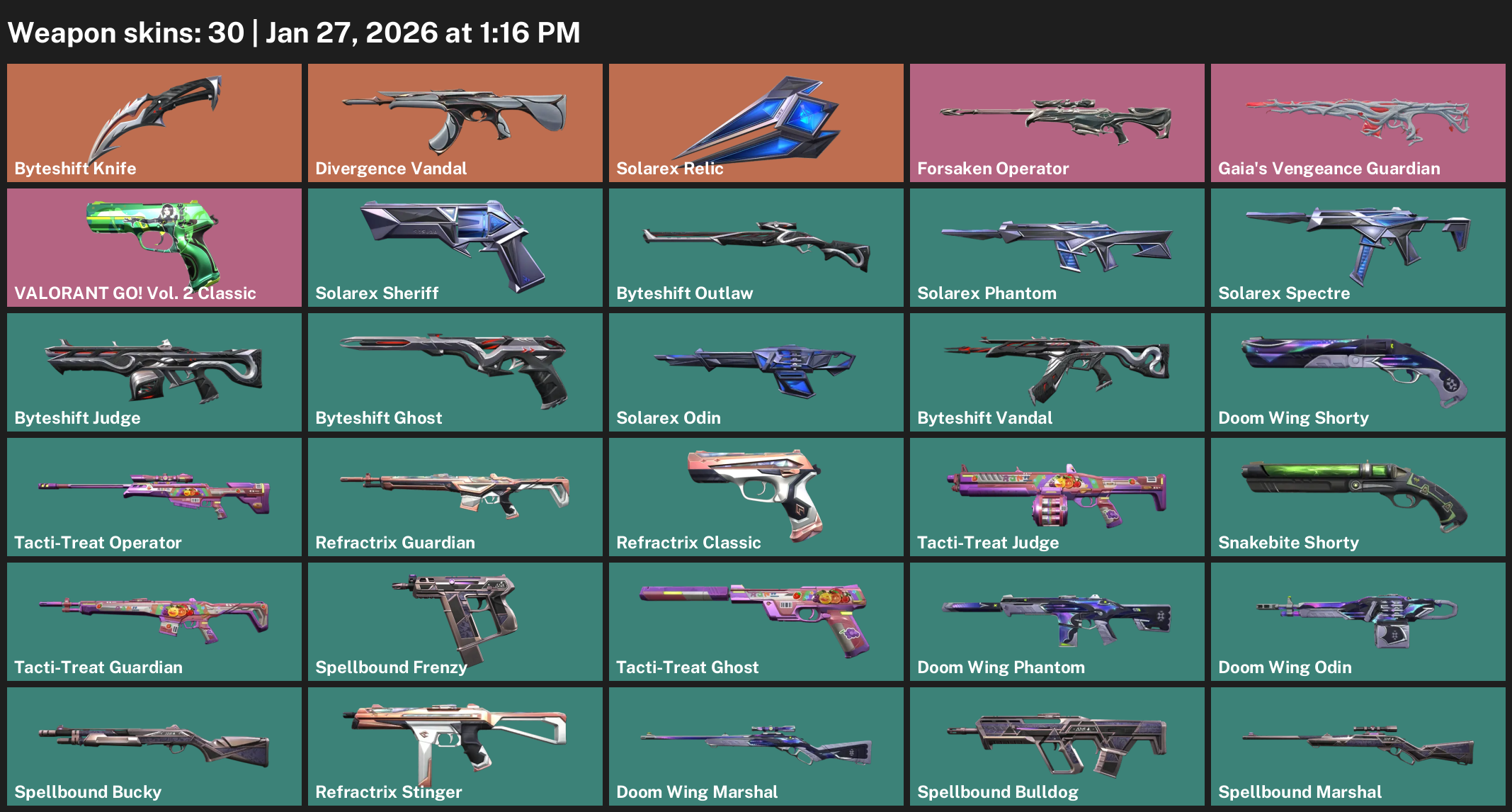 Byteshift Knife, Divergence Vandal, Solarex Relic, Forsaken Operator, Gaia’s Vengeance Guardian, VALORANT GO! Vol. 2 Classic, Doom Wing Shorty, Tacti-Treat Judge, Spellbound Frenzy