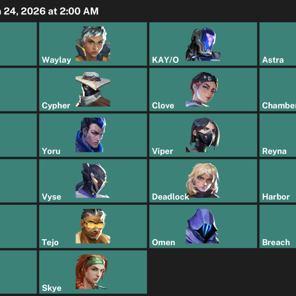 Omen, Astra, Waylay, Killjoy, KAY/O, Gekko, Fade, Deadlock, Cypher, Chamber, Tejo, Clove, Raze, Vyse, Reyna