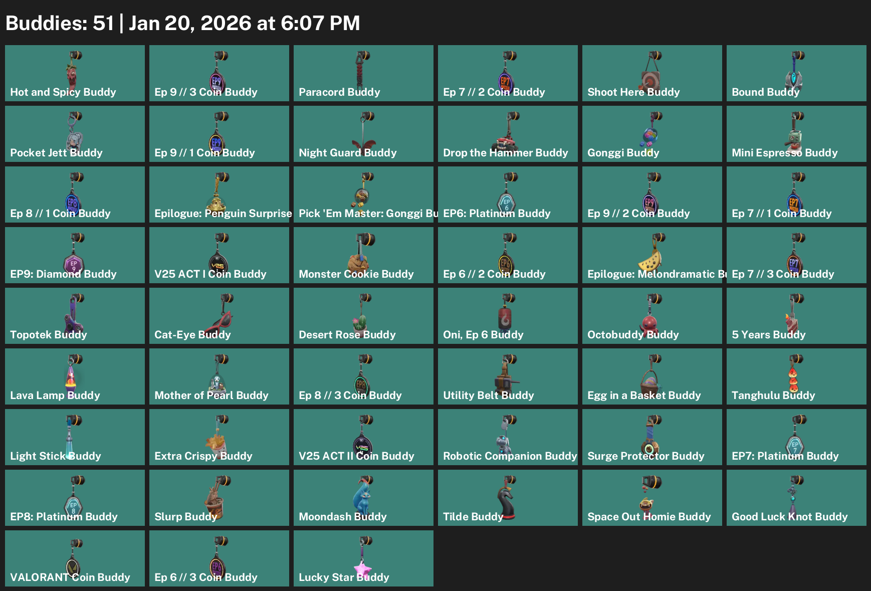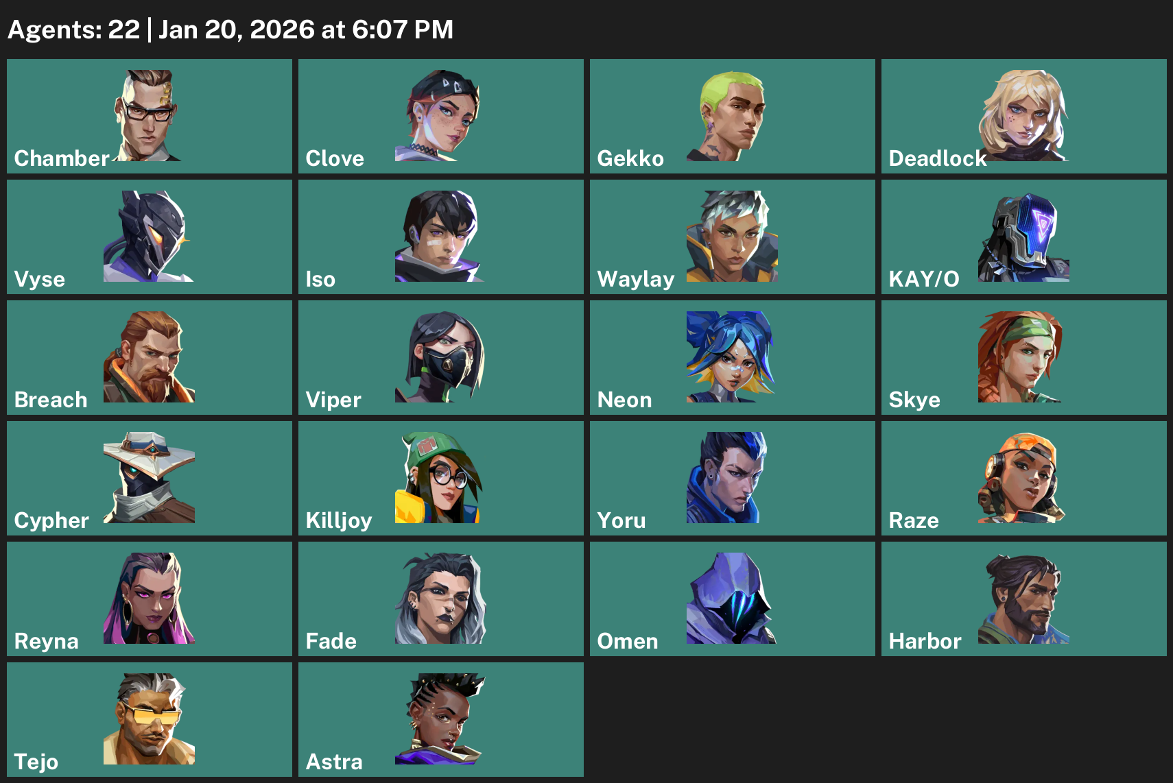 Chamber, Clove, Gekko, Deadlock, Vyse, Iso, Waylay, KAY/O, Breach, Viper, Neon, Skye, Cypher, Killjoy, Yoru, Raze, Reyna, Fade, Omen, Harbor, Tejo, Astra