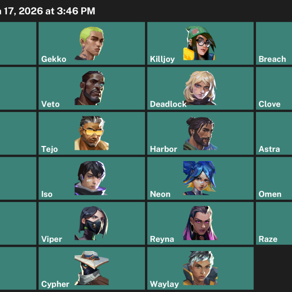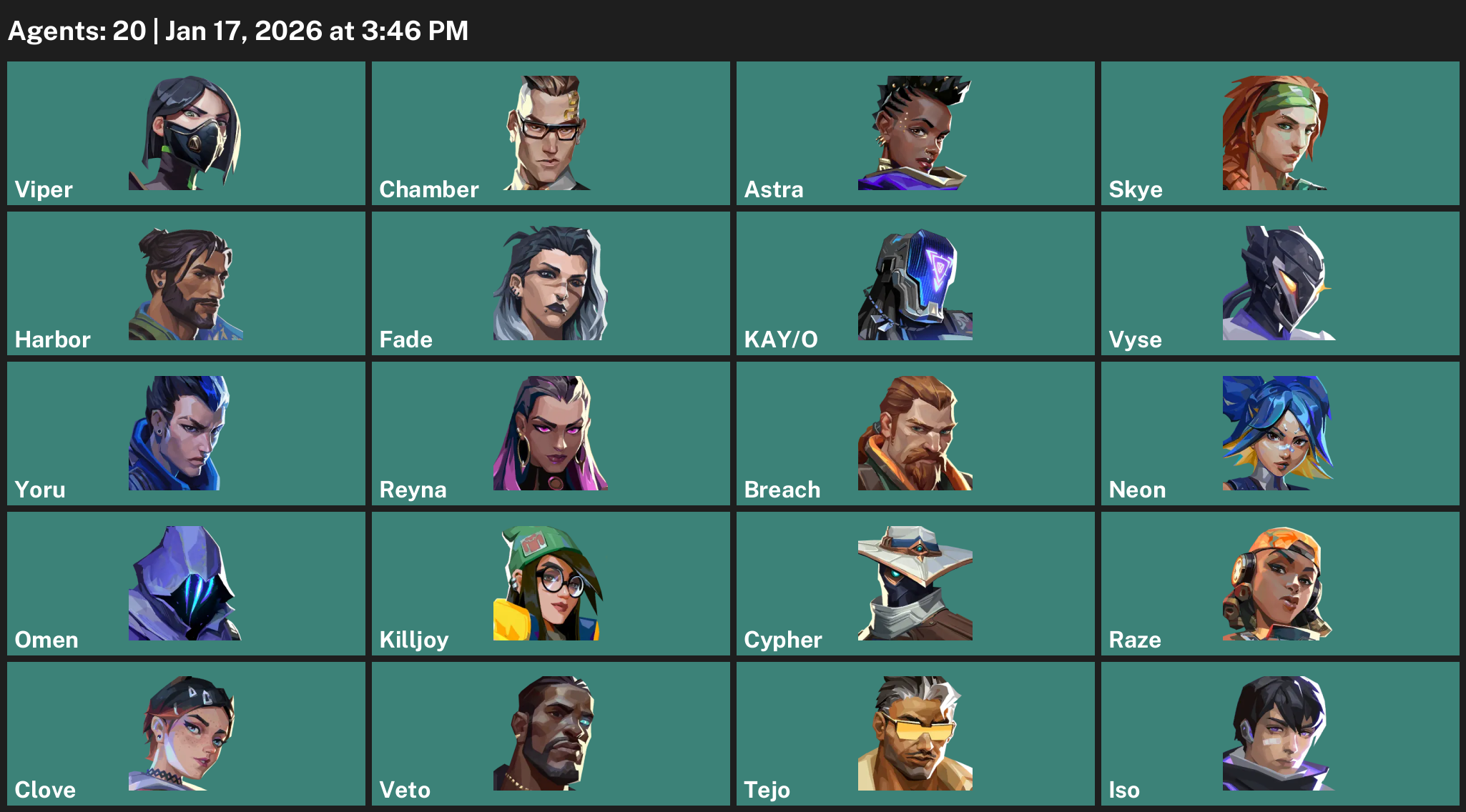 Viper, Chamber, Astra, Skye, Harbor, Fade, KAY/O, Vyse, Yoru, Reyna, Breach, Neon, Omen, Killjoy, Cypher, Raze, Clove, Tejo, Iso