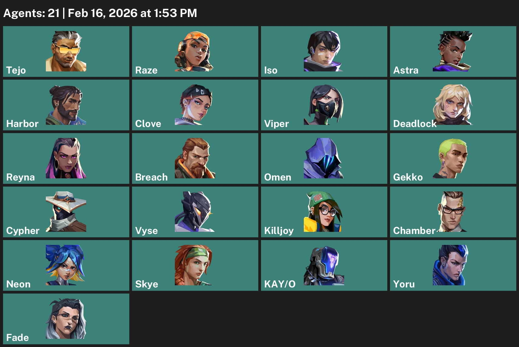 Tejo, Raze, Iso, Astra, Harbor, Clove, Viper, Deadlock, Reyna, Breach, Omen, Gekko, Cypher, Vyse, Killjoy, Chamber, Neon, Skye, KAY/O, Yoru, Fade