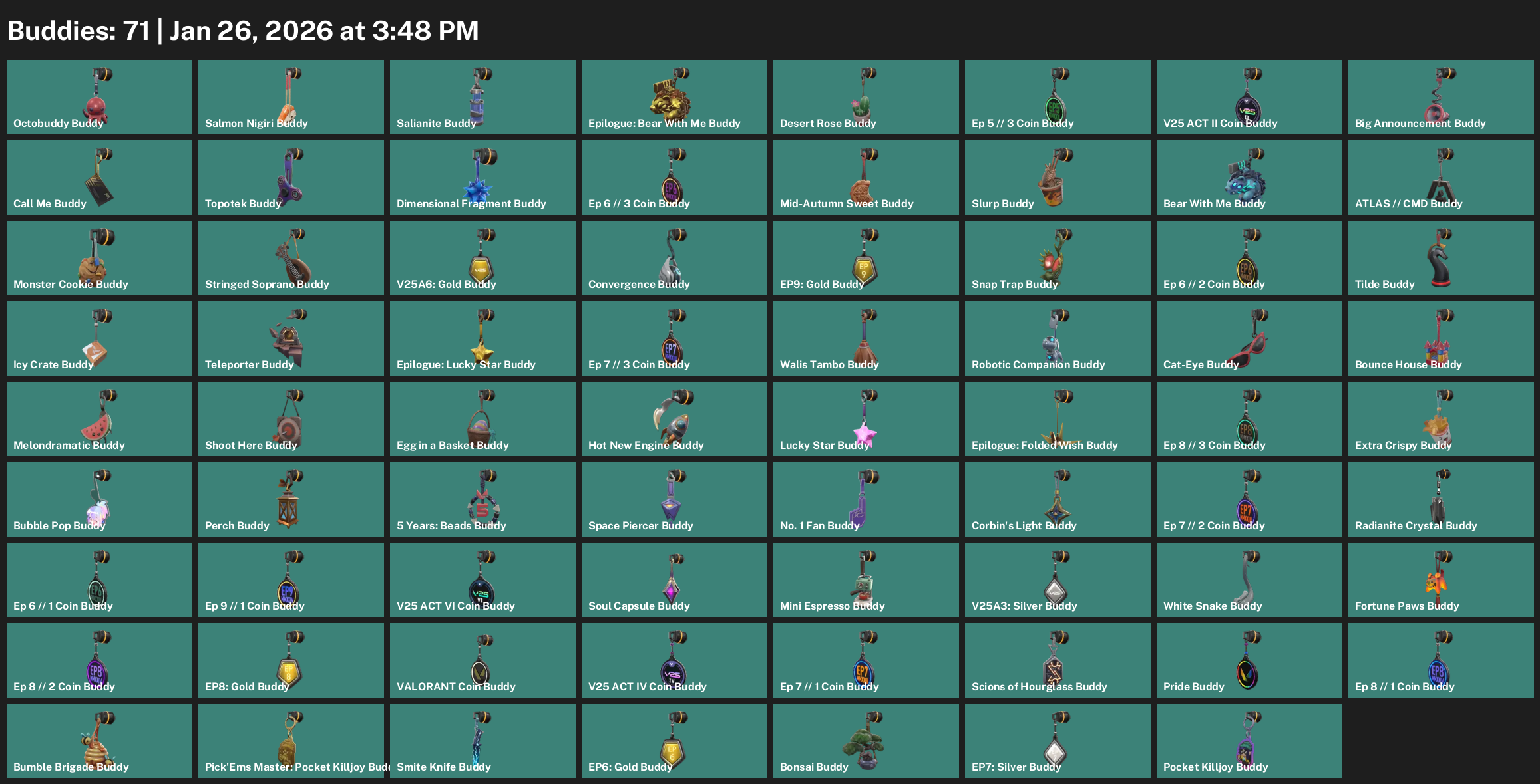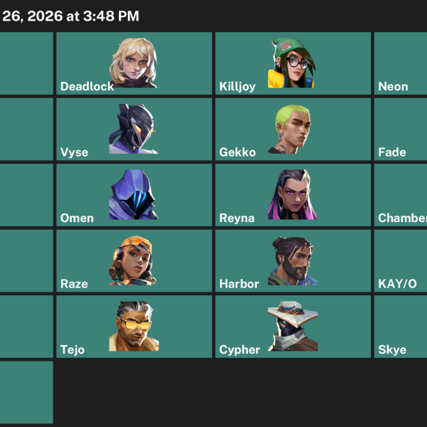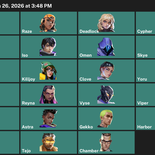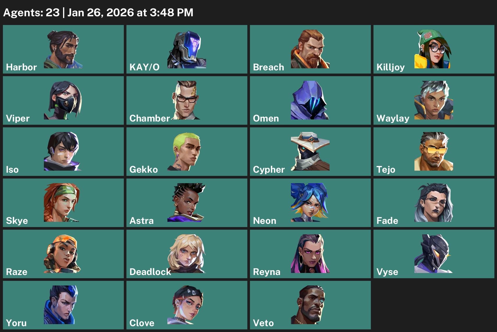 Harbor, KAY/O, Breach, Killjoy, Viper, Chamber, Omen, Waylay, Iso, Gekko, Cypher, Tejo, Skye, Astra, Neon, Fade, Raze, Deadlock, Reyna, Vyse, Yoru, Clove