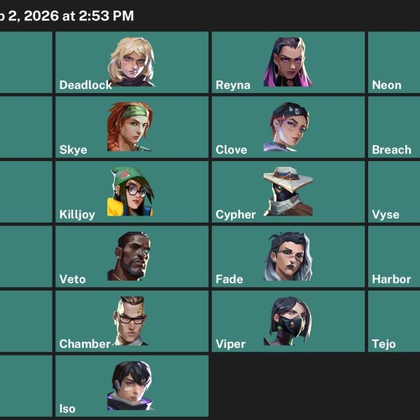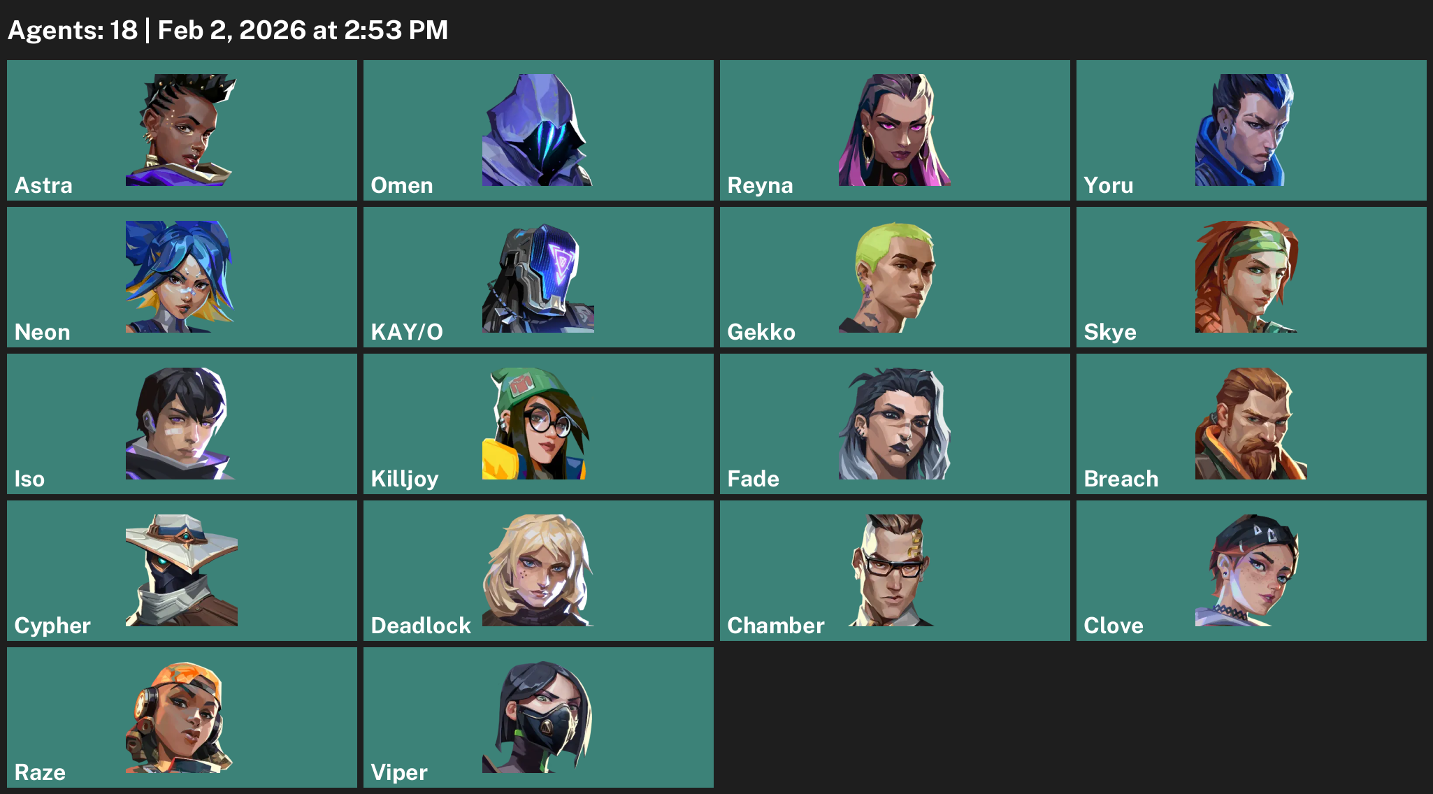 Astra, Omen, Reyna, Yoru, Neon, KAY/O, Gekko, Skye, Iso, Killjoy, Fade, Breach, Cypher, Deadlock, Chamber, Clove, Raze, Viper