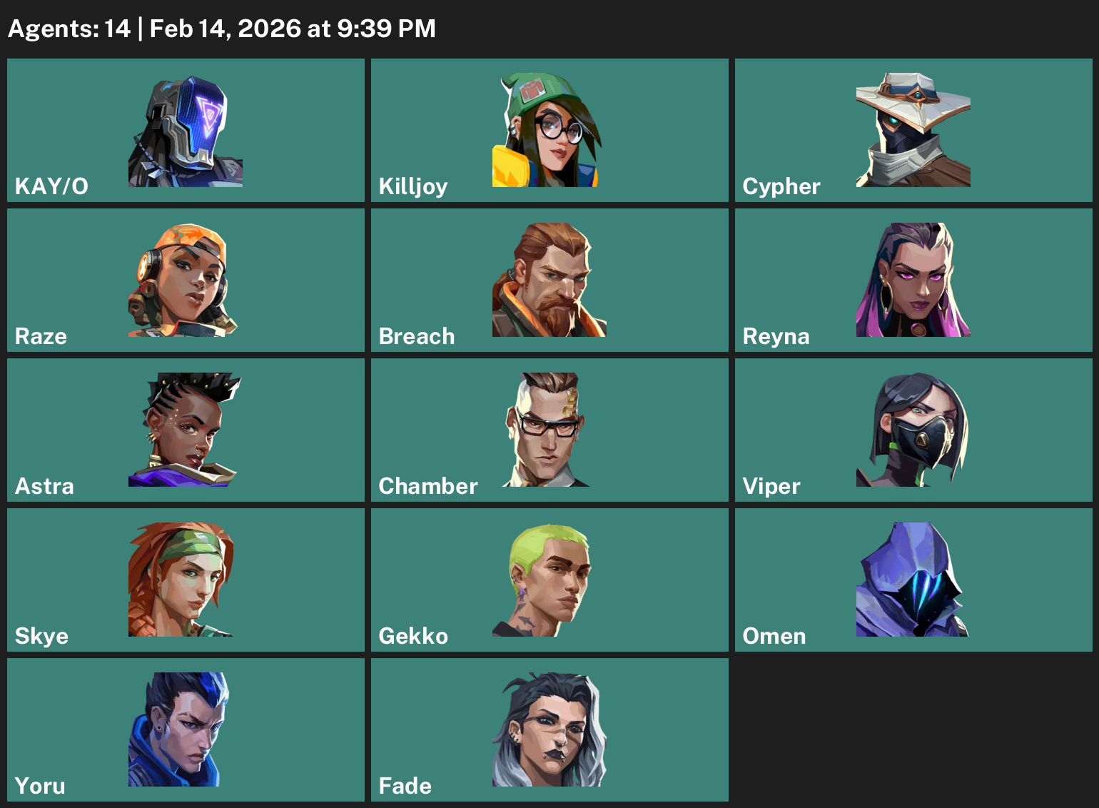 KAY/O, Killjoy, Cypher, Raze, Breach, Reyna, Astra, Chamber, Viper, Skye, Gekko, Omen, Yoru, Fade