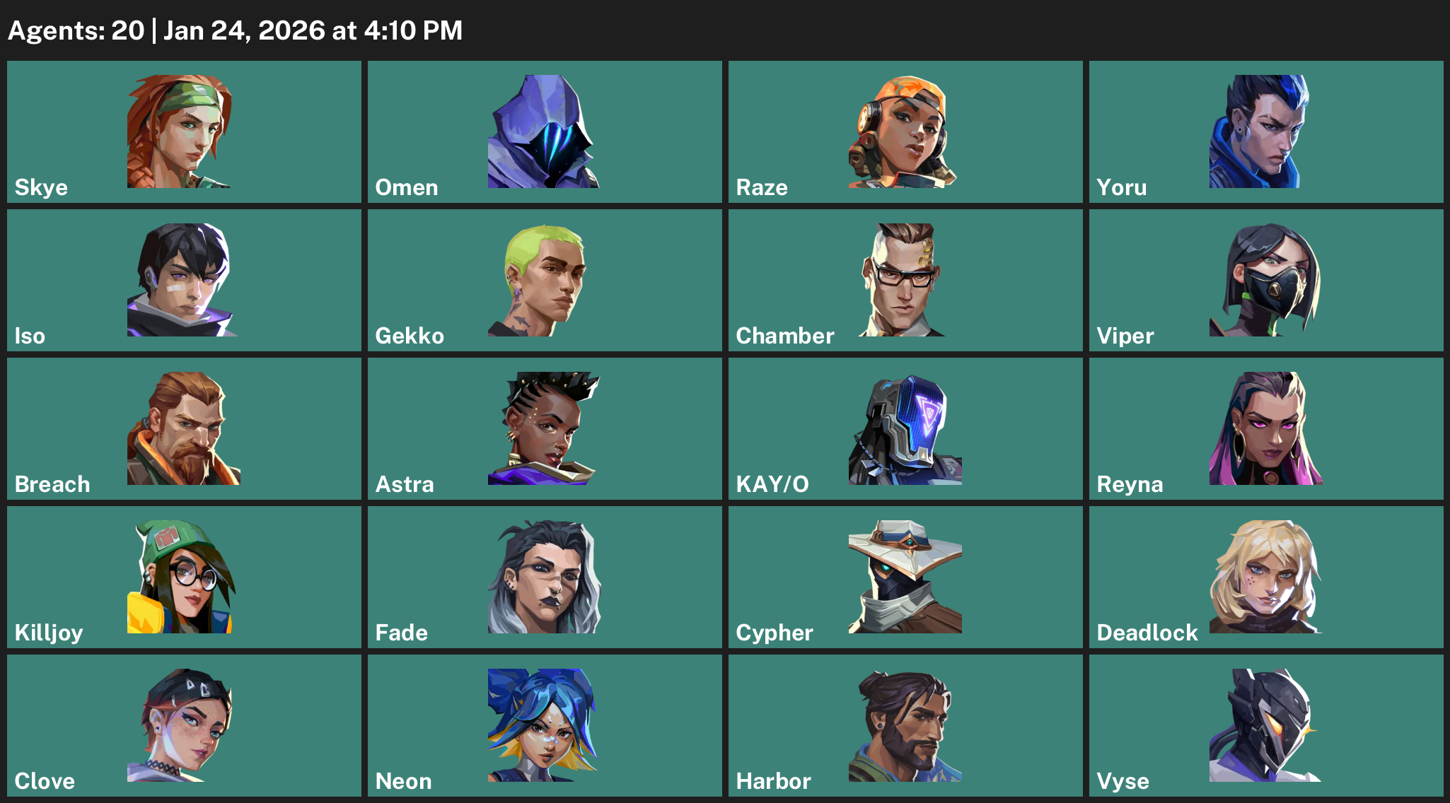 Skye, Omen, Raze, Yoru, Iso, Gekko, Chamber, Viper, Breach, Astra, KAY/O, Reyna, Killjoy, Fade, Cypher, Deadlock, Clove, Neon, Harbor, Vyse