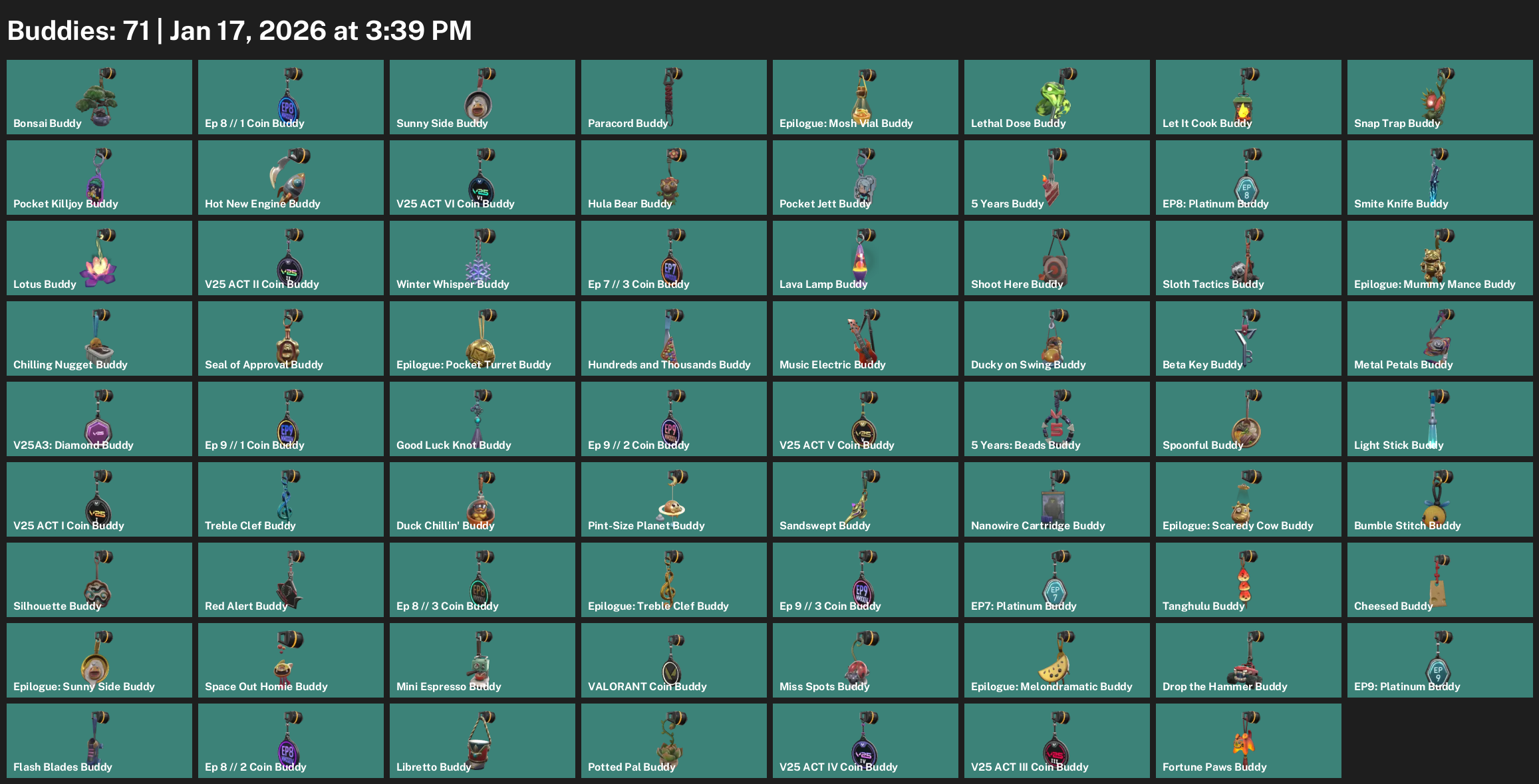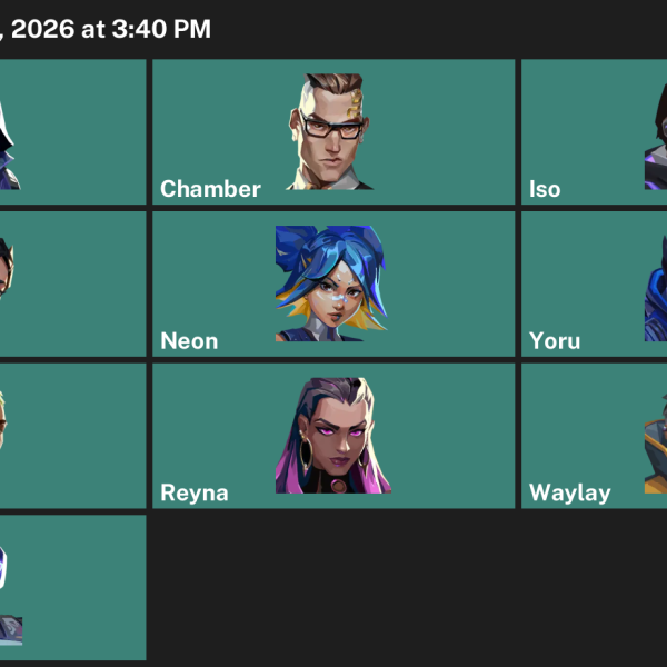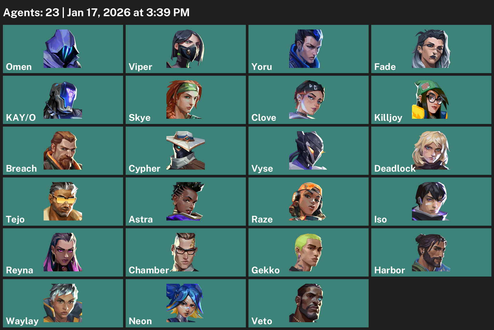 Omen, Viper, Yoru, Fade, KAY/O, Skye, Clove, Killjoy, Breach, Cypher, Vyse, Deadlock, Tejo, Astra, Raze, Iso, Reyna, Chamber, Gekko, Harbor, Waylay, Neon