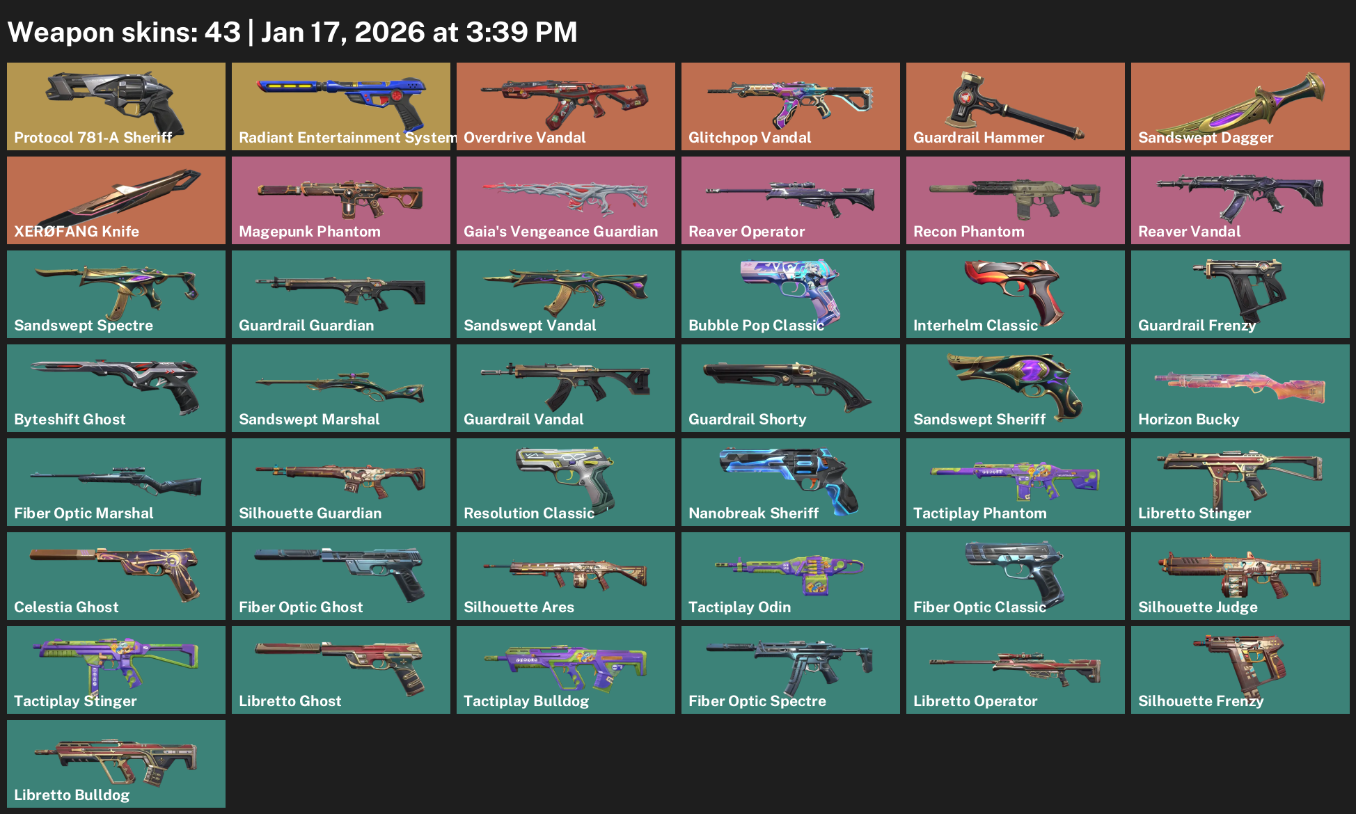 Protocol 781-A Sheriff, Radiant Entertainment System Ghost, Overdrive Vandal, Guardrail Hammer, Sandswept Dagger, XERØFANG Knife, Magepunk Phantom, Gaia’s Vengeance Guardian, Reaver Operator, Bubble Pop Classic, Horizon Bucky, Fiber Optic Marshal