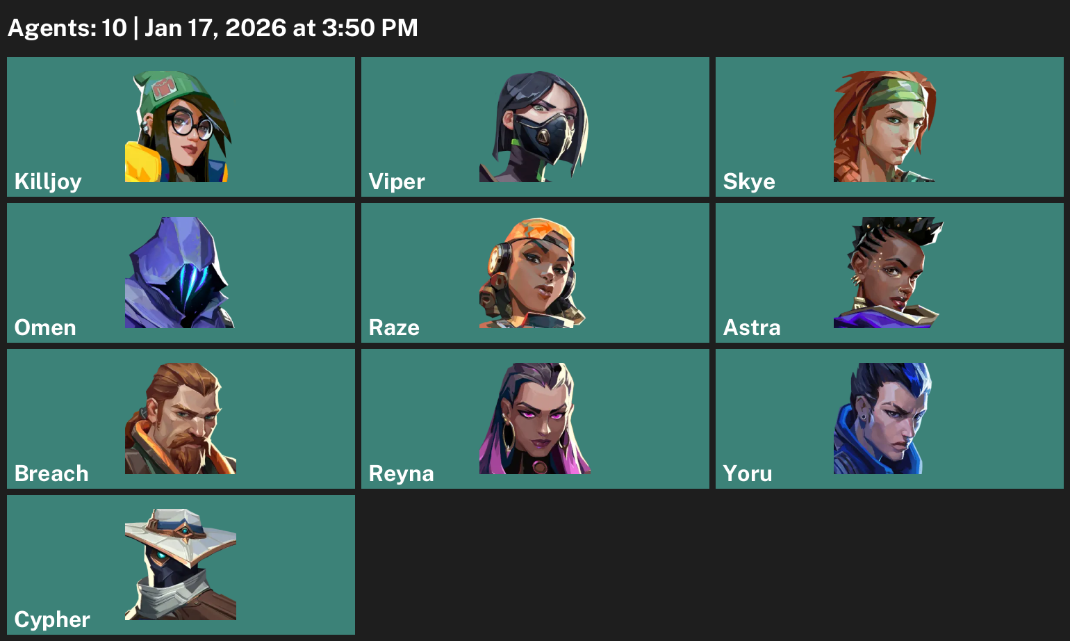 Killjoy, Viper, Skye, Omen, Raze, Astra, Breach, Reyna, Yoru, Cypher